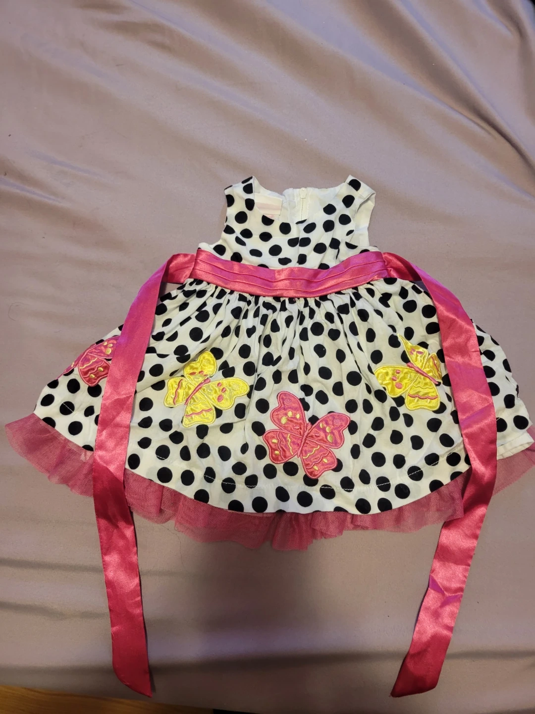 76A cute polka dot dress with pink butterfly accents! Features a pink ribbon and a tulle trim. Perfect for a little one!
