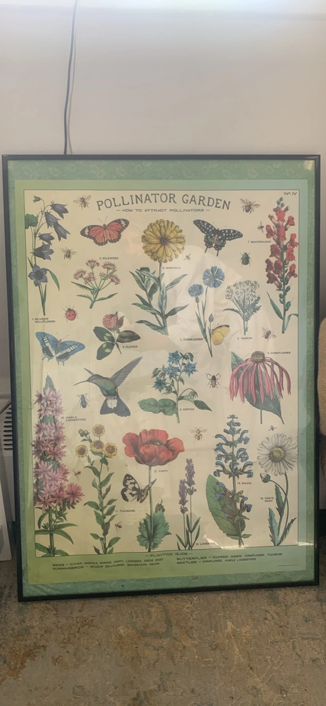 109Framed print of a botanical chart titled "Pollinator Garden", features a variety of flowers, insects, and birds. Includes a planting guide.