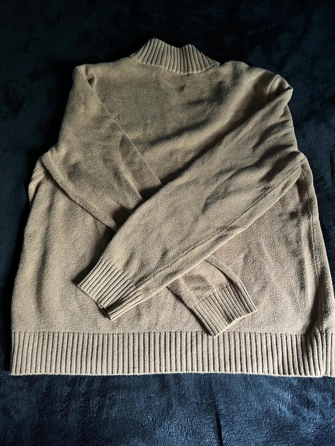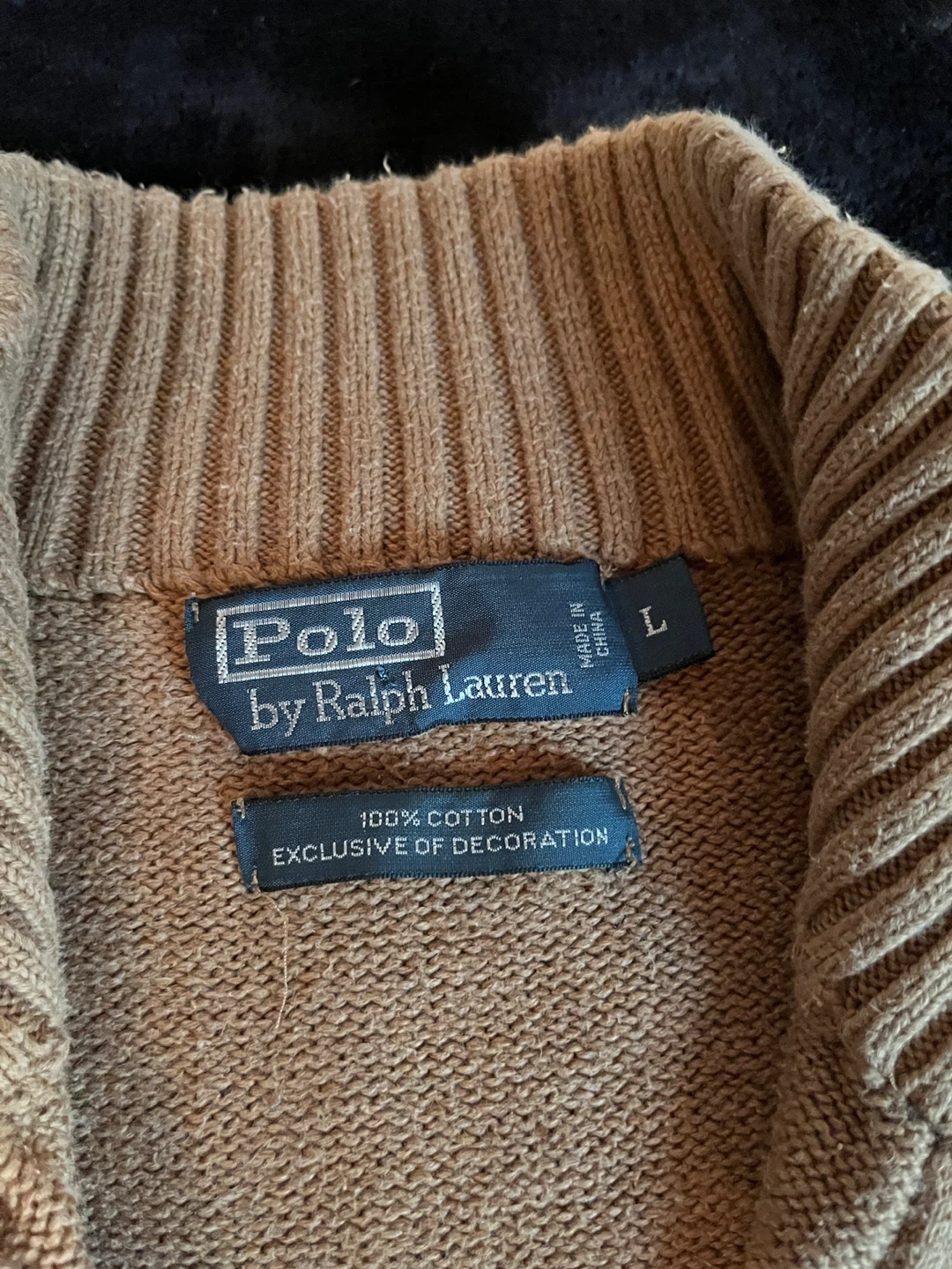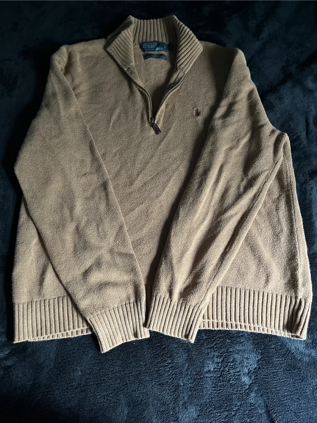10Selling a Polo Ralph Lauren 1/4 zip sweater in a neutral tan colour. It's a size large and made of 100% cotton, good for fall weather!