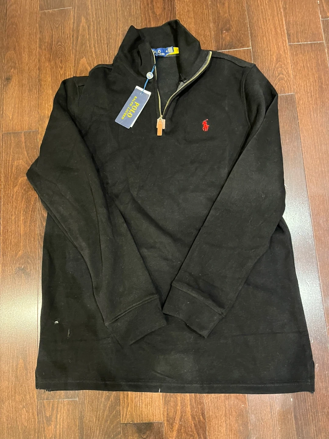 10This is a Polo Ralph Lauren 1/4 zip pullover in black. It's in great condition and is a size XL. Perfect for layering or wearing on its own!