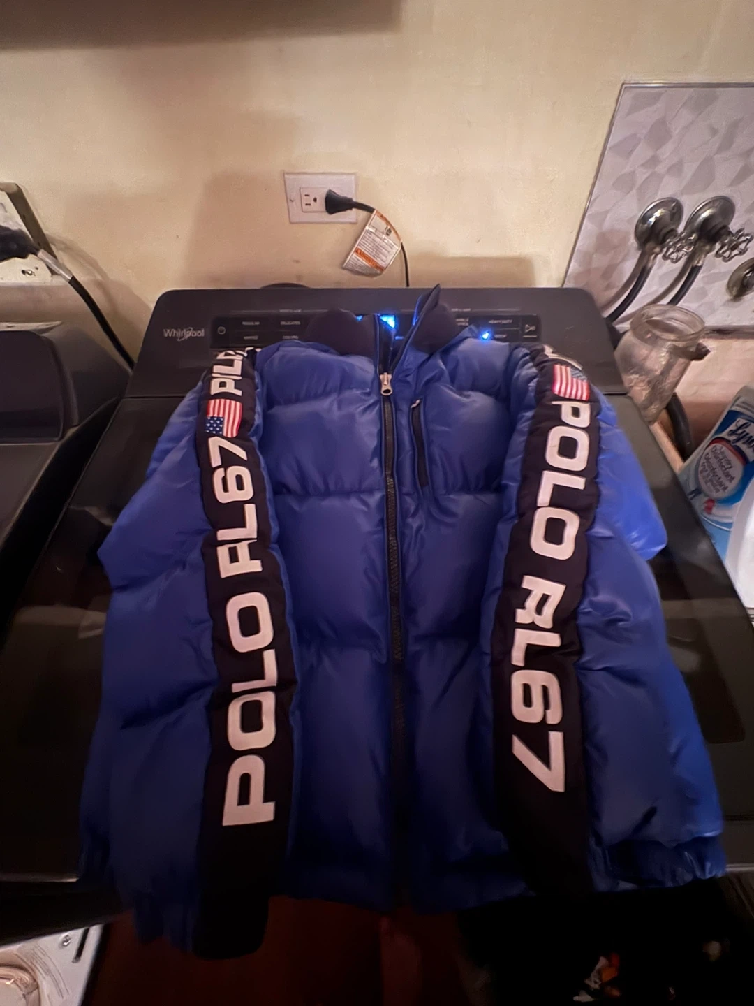 Here's a Polo Ralph Lauren puffer jacket in blue! It has the 'POLO FL67' and 'POLO RL67' design on the sleeves. Great for staying warm and stylish during the colder months Child size medium 10/12 Pu Surrey