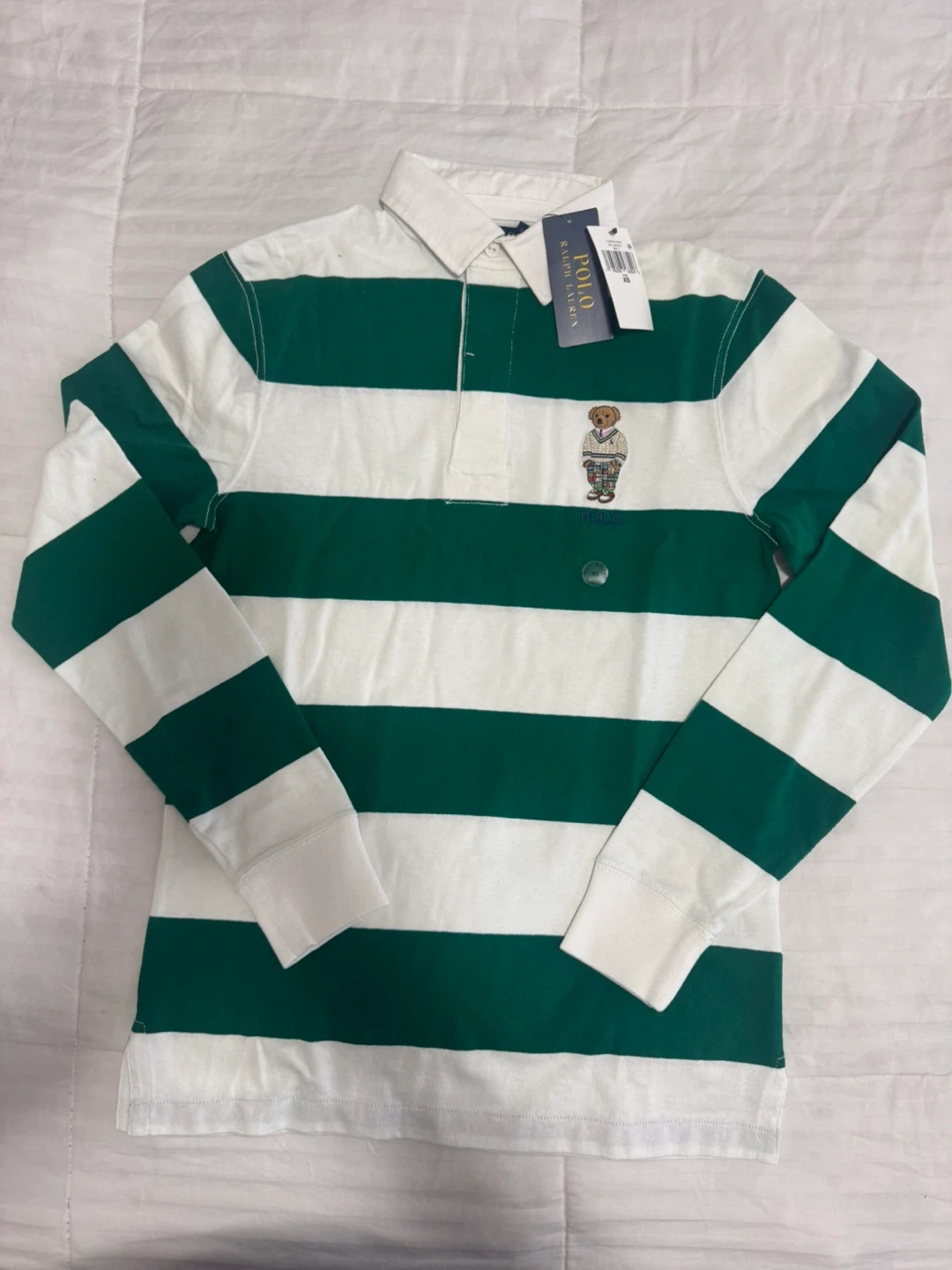 Here's a Polo Ralph Lauren rugby shirt! It features a green and white striped design with the iconic Polo Bear logo. Perfect for a casual and stylish look!