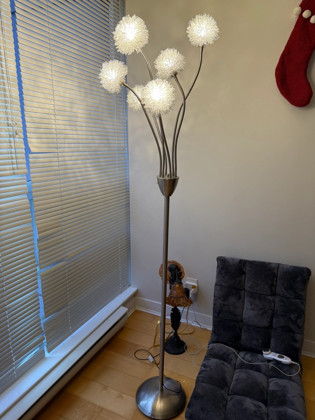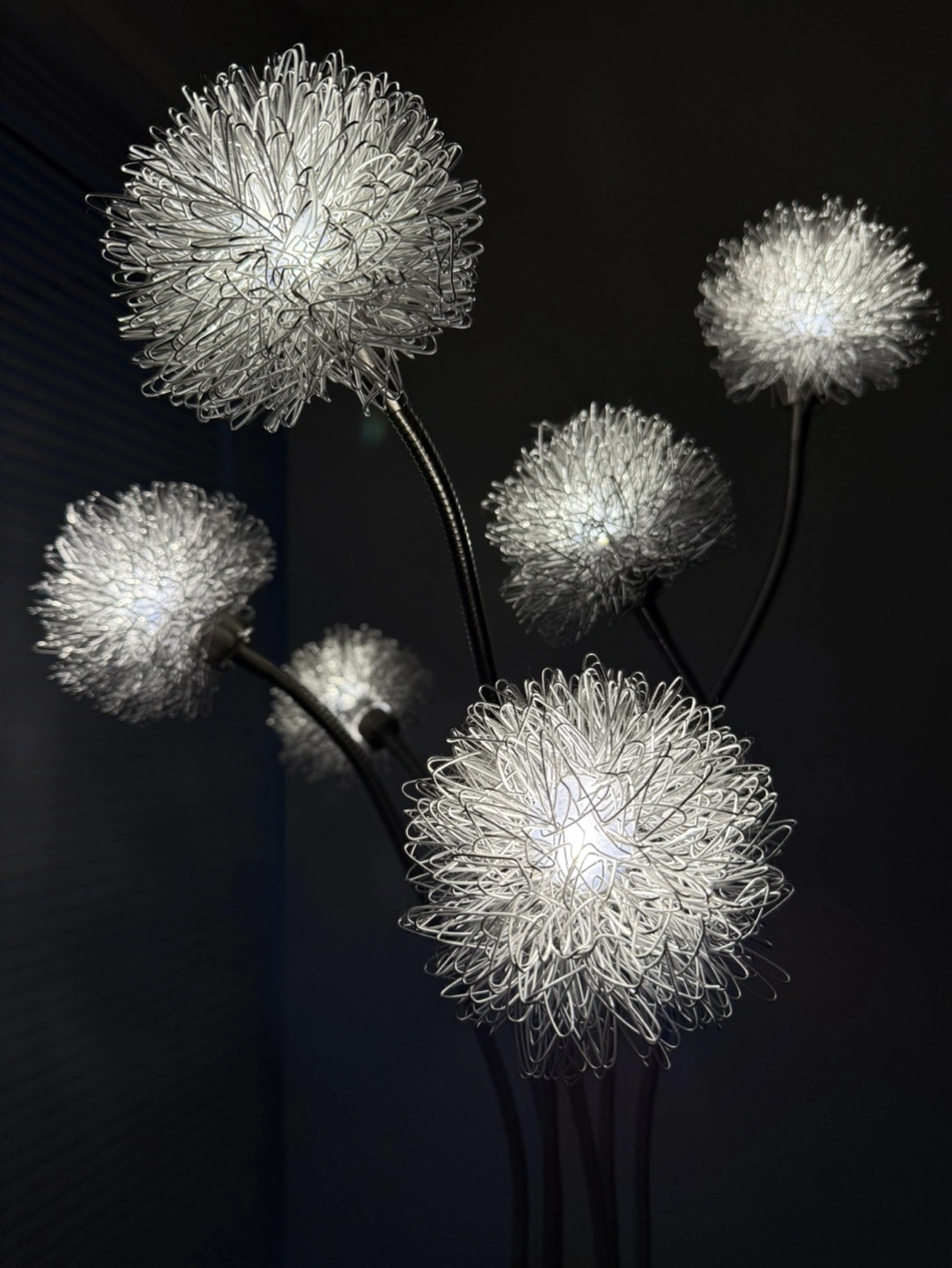 10Tall floor lamp with a silver base and six lights resembling dandelions. The lights are made of wire with a clear plastic covering.