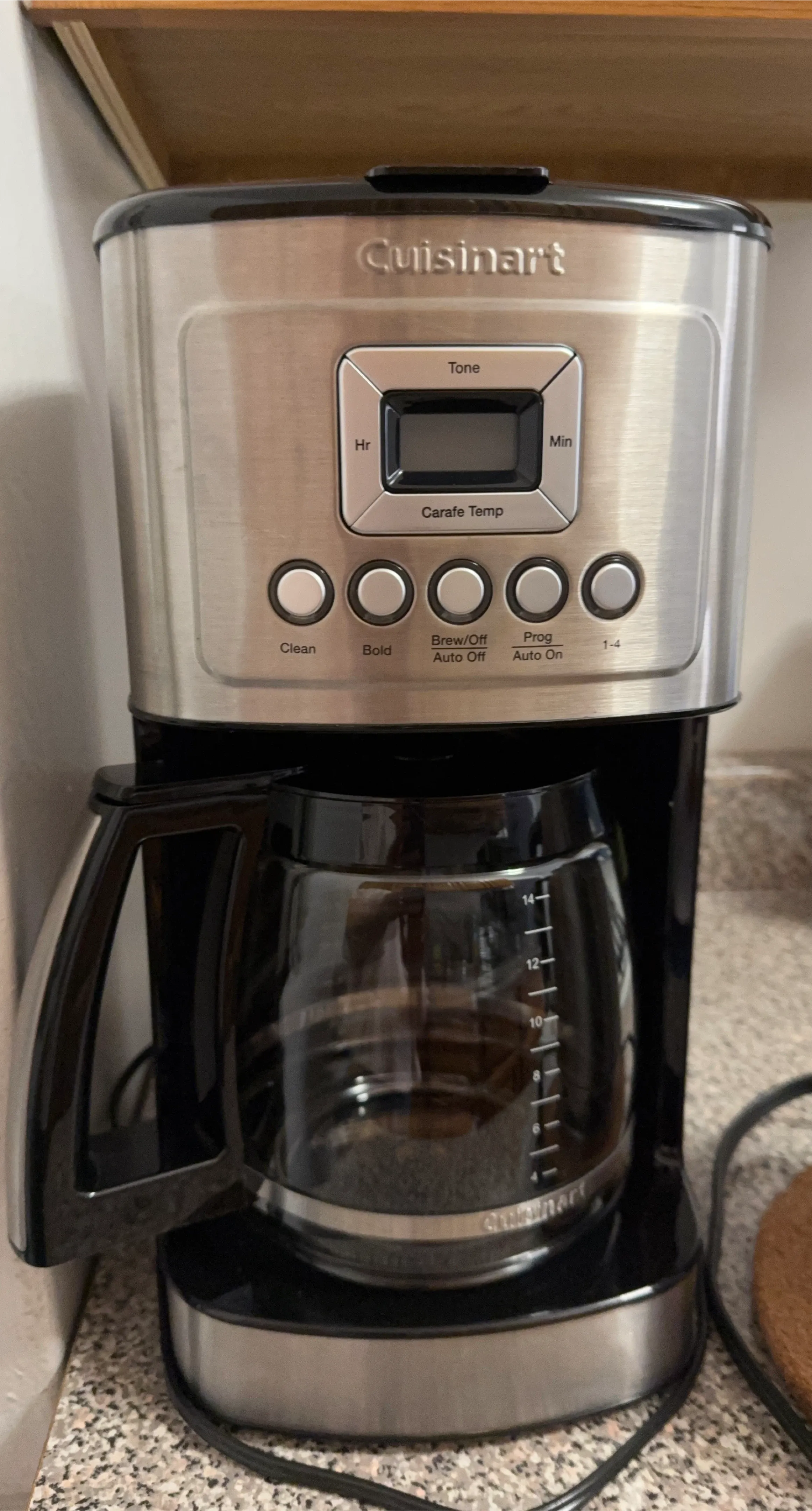 Cuisinart coffee maker with programmable features. Includes settings for brew strength and carafe temperature. Features a 14-cup capacity carafe.