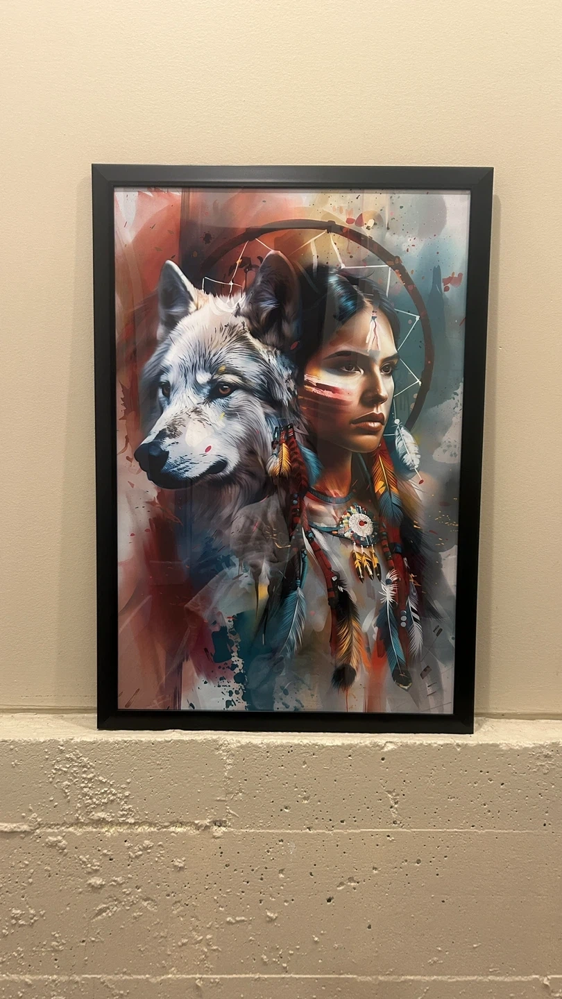 Beautiful framed art print featuring a wolf and Native American figure. Brand new. 16 x 24 inches