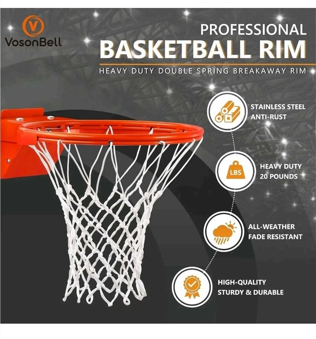 Score big with this durable VosonBell basketball rim! Featuring a heavy-duty, double spring breakaway design, this rim is built to withstand intense play. Although it's been mounted before, it's still in good shape for countless games to come. Get ready to elevate your game and bring the excitement of the court to your home! I have used this for a few games with my friends and it is still in decent condition. Heavy Duty, Double Spring Breakaway Rim, Stainless Steel, All-Weather Fade Resistant, Fits Most Standard Backboards. Looking at similar listings on Kijiji, I'd say $170 is a fair price. If you're seeing this ad, then yes, the rim is still available!