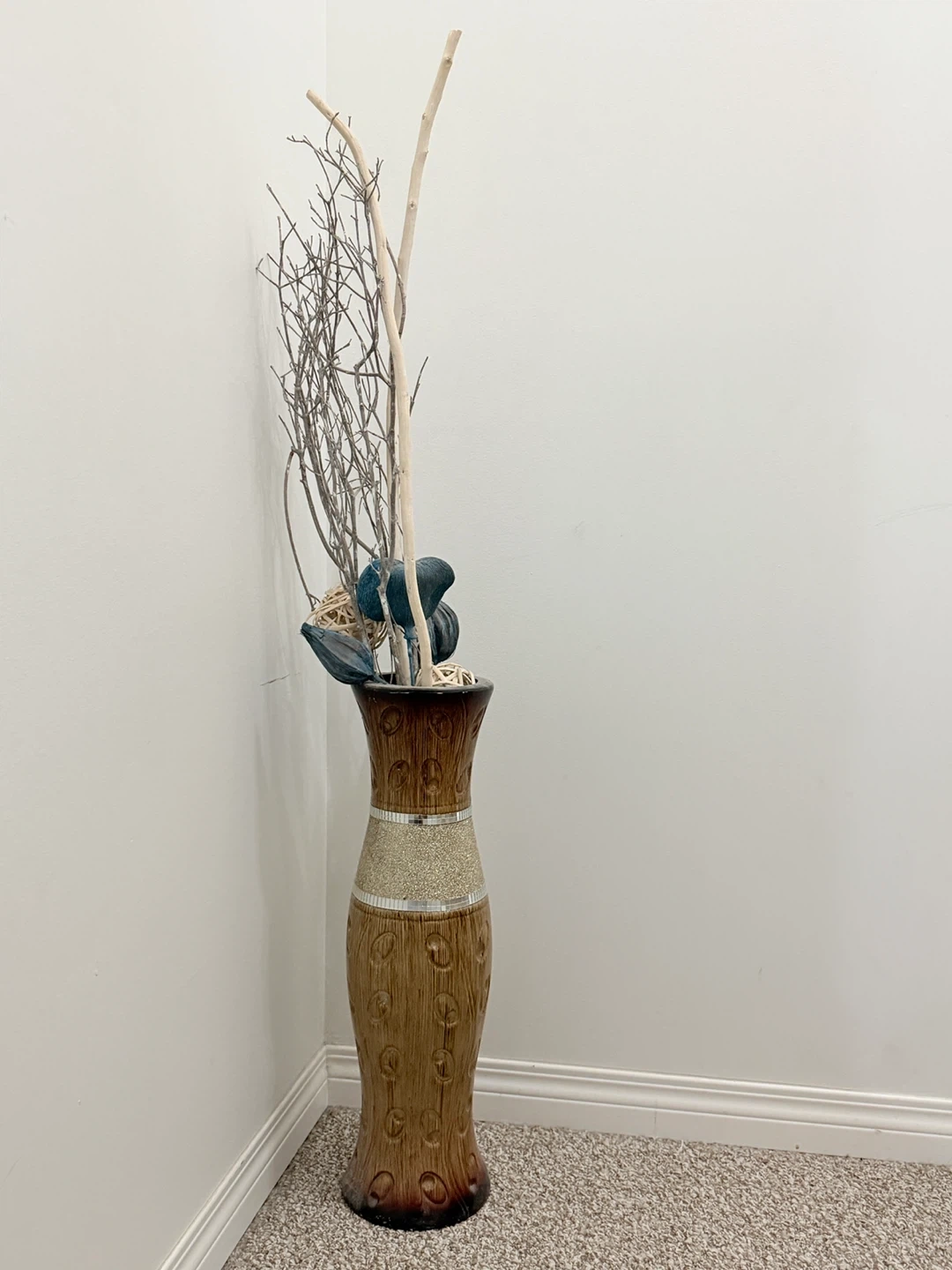 This tall decorative vase features a textured brown finish with a shimmering mosaic band. It comes with an arrangement of dried branches and decorative accents. Its substantial size makes it a statement piece for any room!