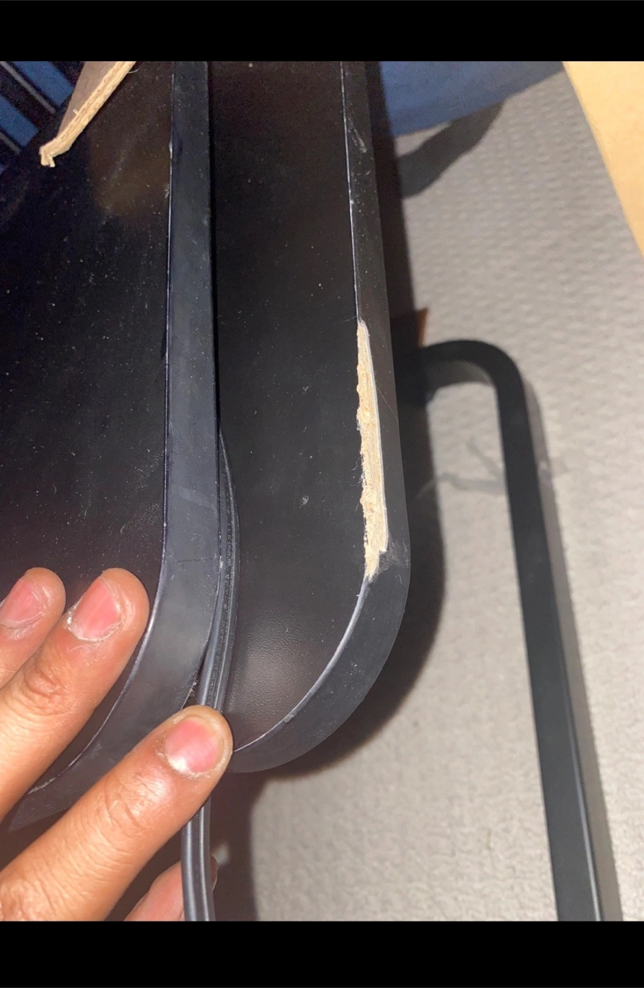 Black standing desk converter. Features adjustable height and monitor mount. Small damage to corner. Includes keyboard tray.