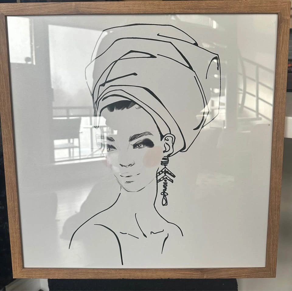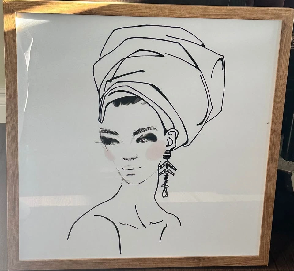 Modern minimalist framed art featuring an elegant illustrated woman in a headwrap. Neutral tones with black linework and soft blush accents. Works beautifully in modern, boho, or minimalist spaces.