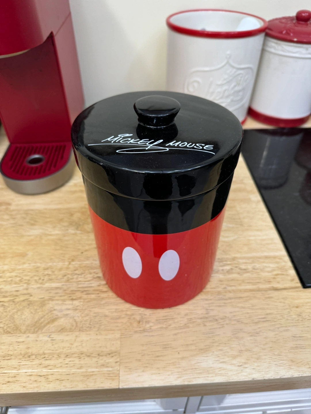 Ceramic container with Mickey Mouse design. Red and black with white accents. Includes lid.