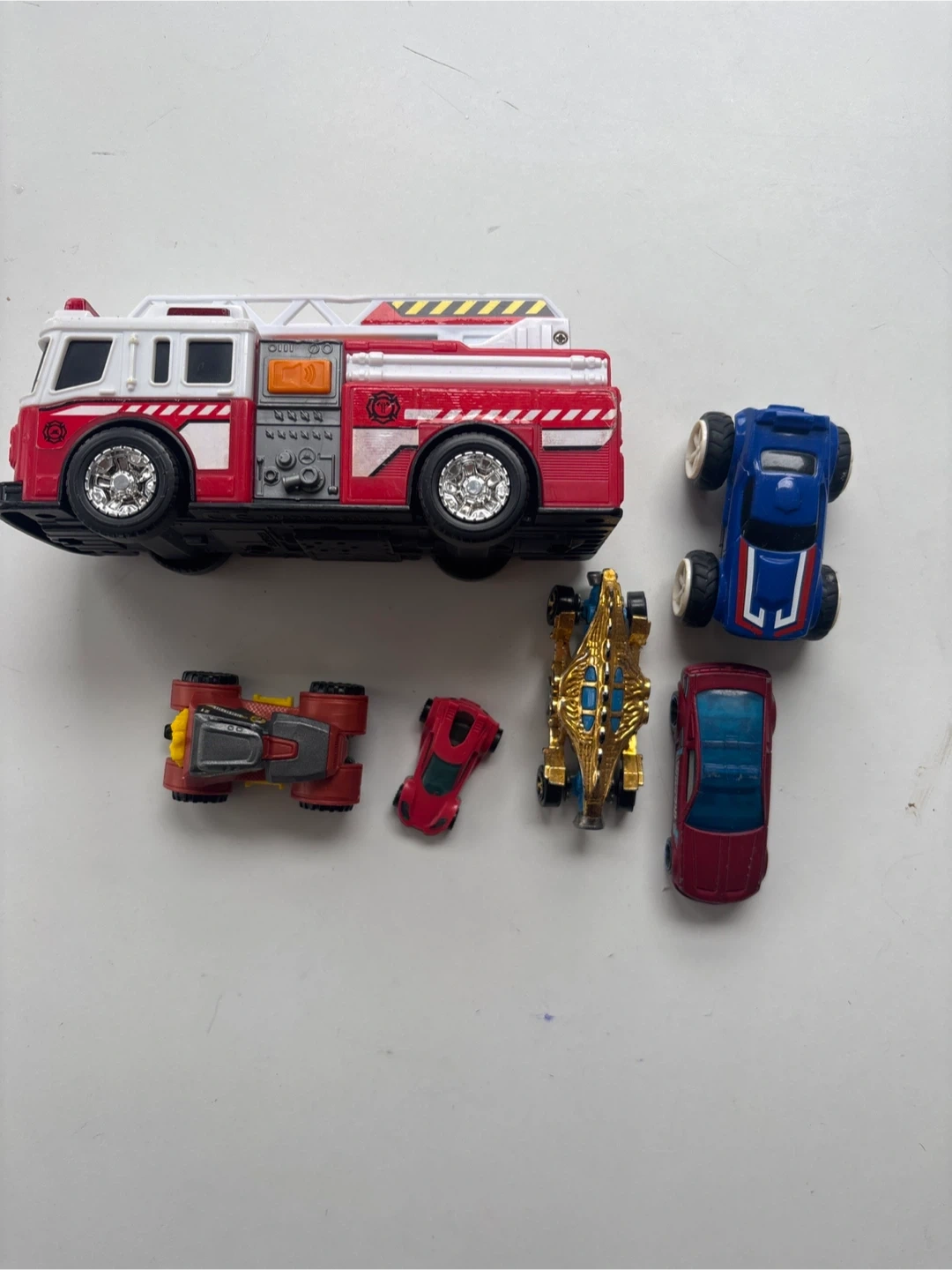 This is a set of toy vehicles including a fire truck and four smaller cars. The fire truck is red and white with a ladder. The cars are in various colours and designs.