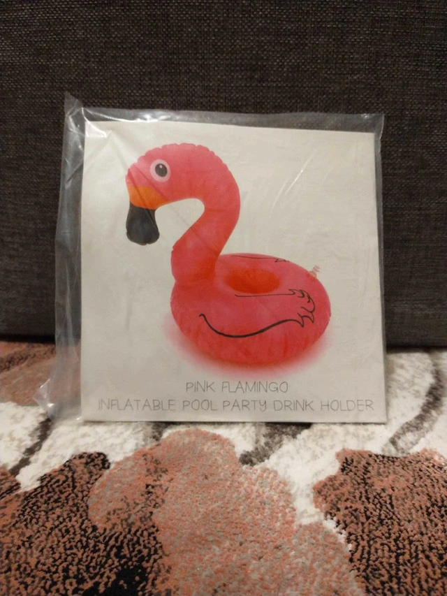 15Pink flamingo inflatable pool floatie drink holder. New in package. Pick up near Lesperance and the Expressway.