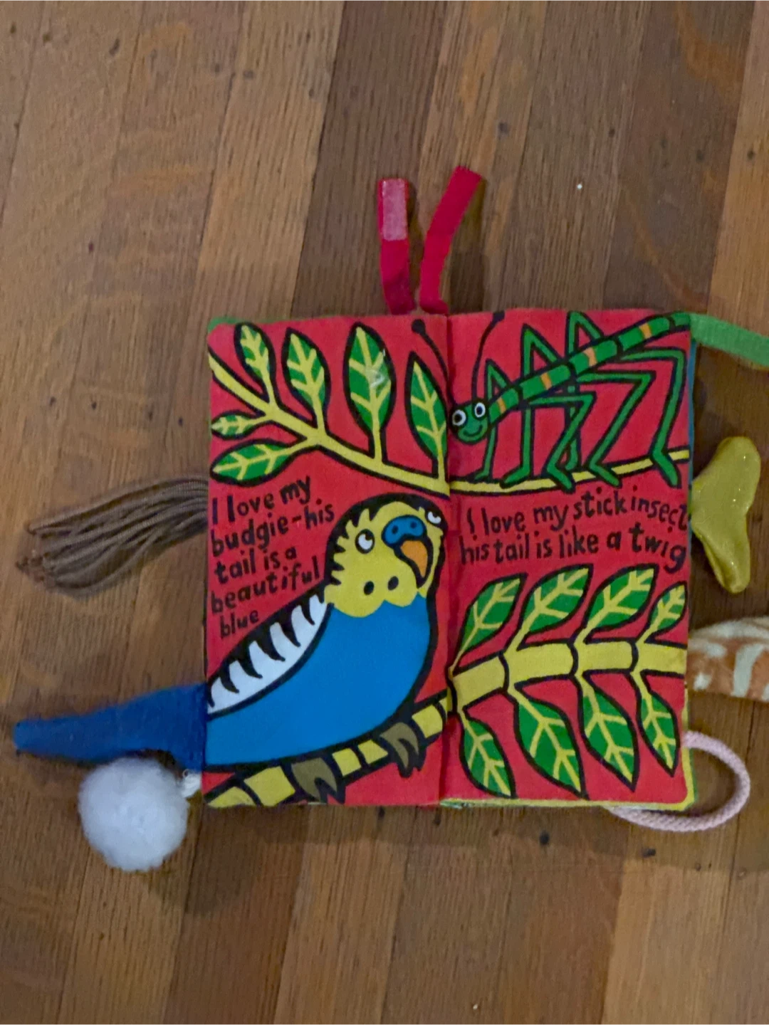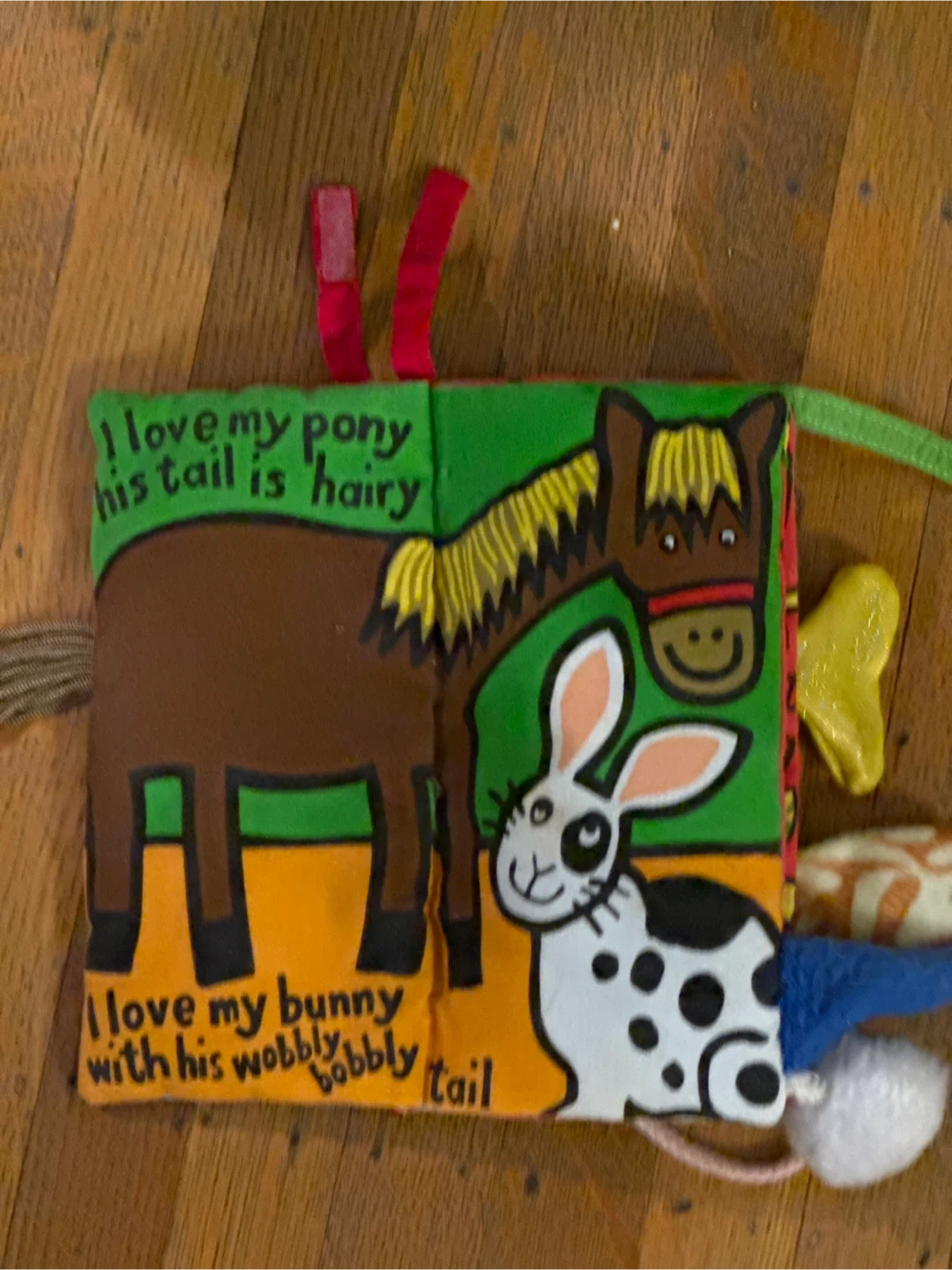 This is a cute soft book for babies called Pet Tails! Each page features a different animal and a little rhyme about their tail. It's in great condition and perfect for little hands to explore