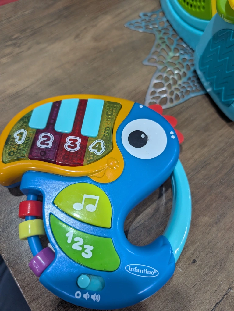 Selling a cute Infantino Toucan Piano! It's in great condition and ready for a new home. This fun toy features colourful keys, number buttons, and musical notes to keep your little one entertained while learning. Perfect for introducing music and numbers to your baby!