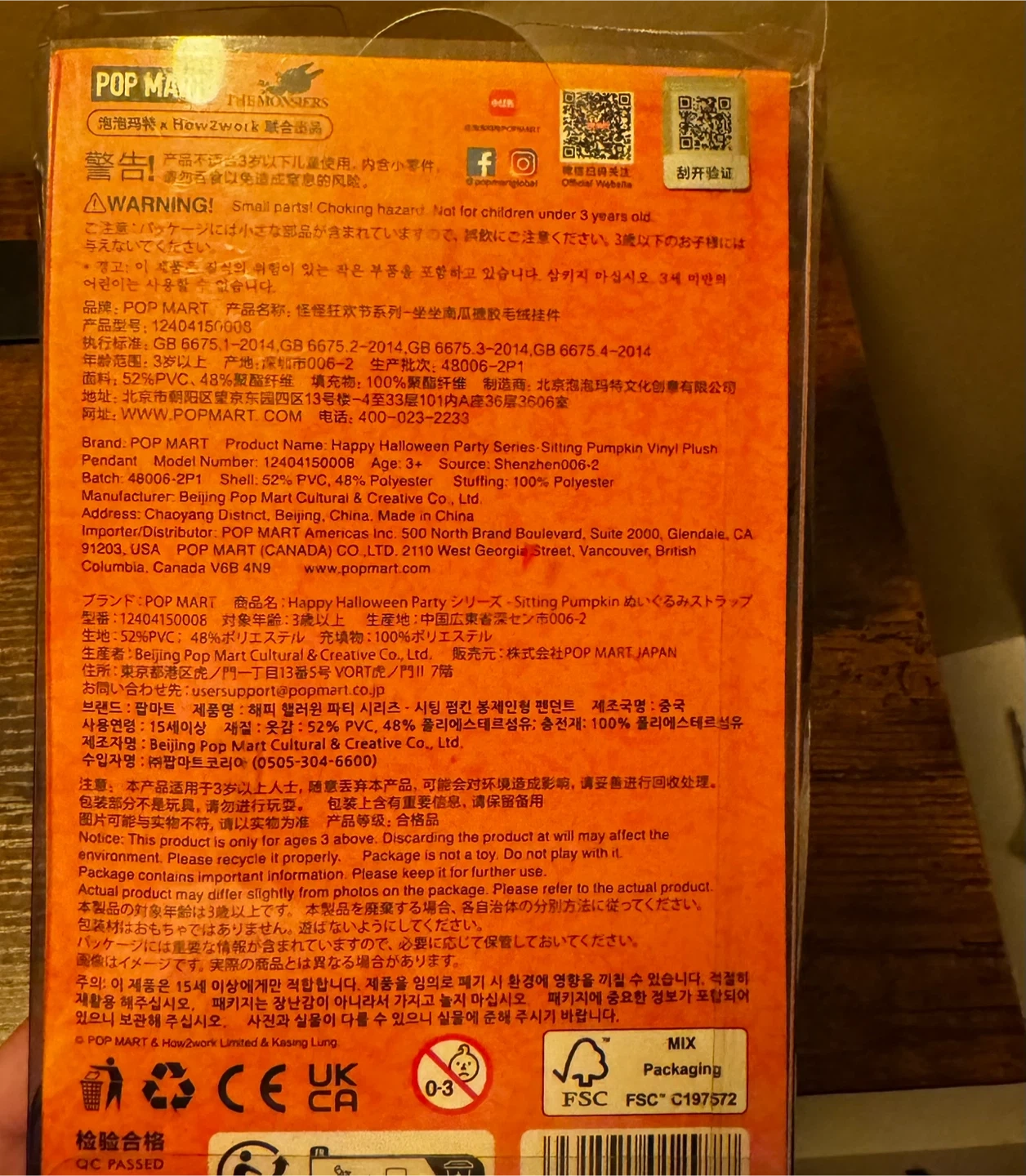 18This is a brand new Pop Mart Sitting Pumpkin Vinyl Plush Pendant, still in its original packaging! It's super cute and perfect for Halloween. The material is 52% PVC and 48% Shell. The stuffing is 100% polyester. Suitable for ages 3 and up