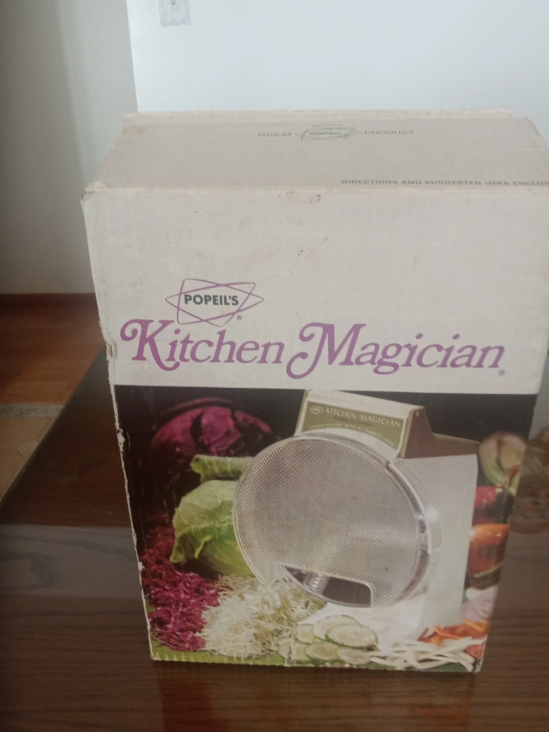 49Selling a Popeil's Kitchen Magician food cutter! It comes with all the pieces shown in the photos, including the box and instruction booklet. This vintage kitchen gadget is great for ripple slicing, shredding, and grating. It's perfect for making coleslaw and other veggie dishes!
