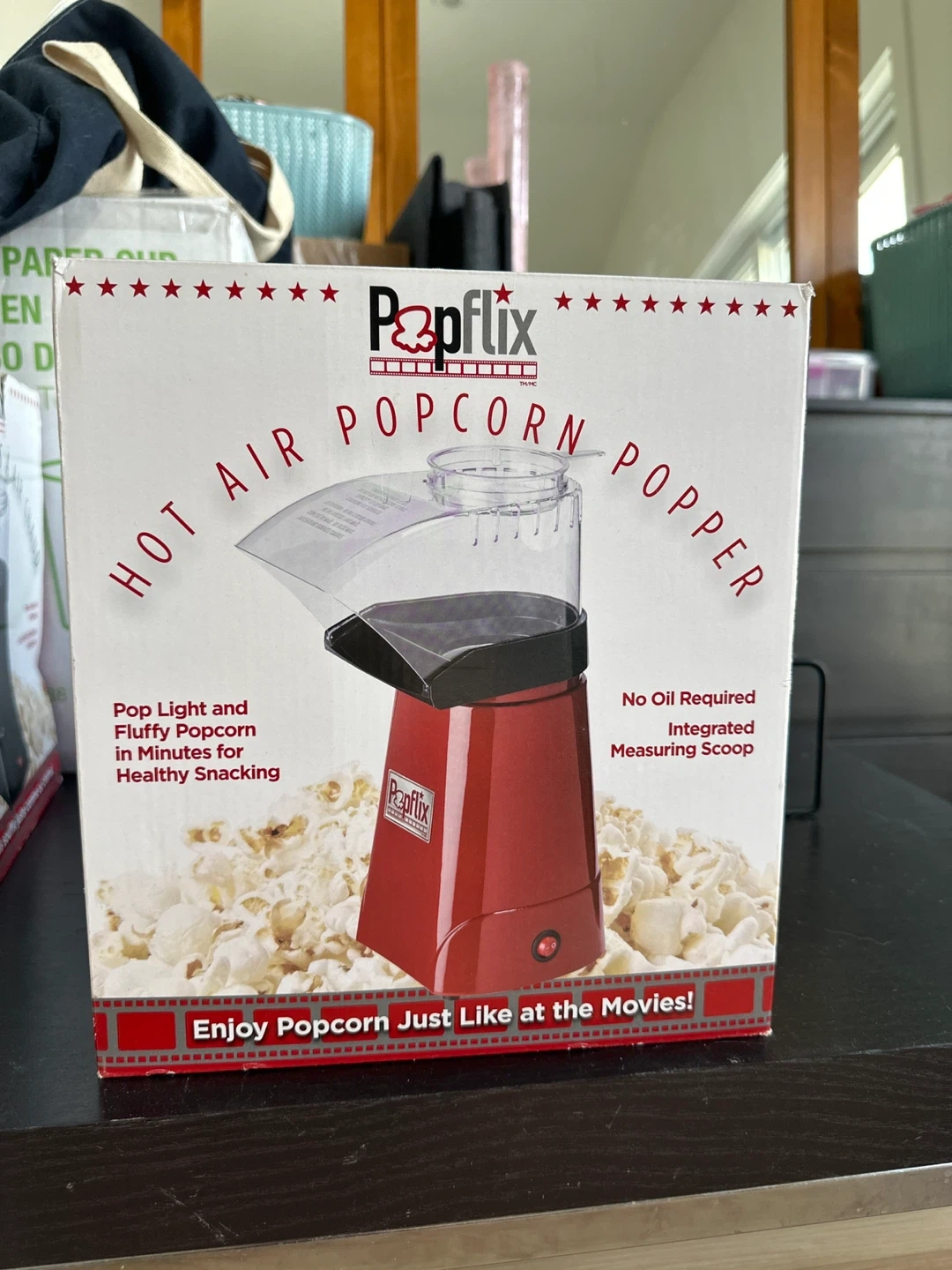 83Enjoy popcorn just like at the movies with this Popflix hot air popcorn popper! It pops light and fluffy popcorn in minutes for healthy snacking. No oil is required, and it has an integrated measuring scoop
