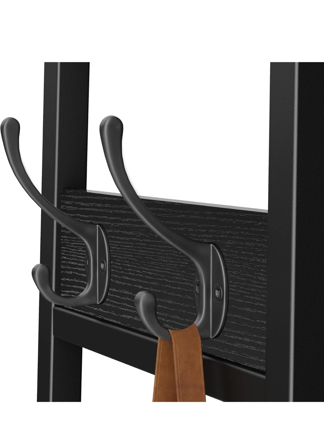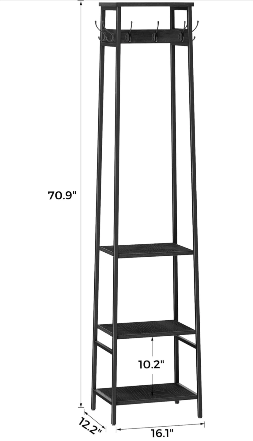 This black coat rack stand features 3 shelves for storage and 7 hooks for hanging items. It's constructed with metal and a wood-look finish. Dimensions are 70.9" H x 16.1" W x 12.2" D. It's a great way to organize your entryway!