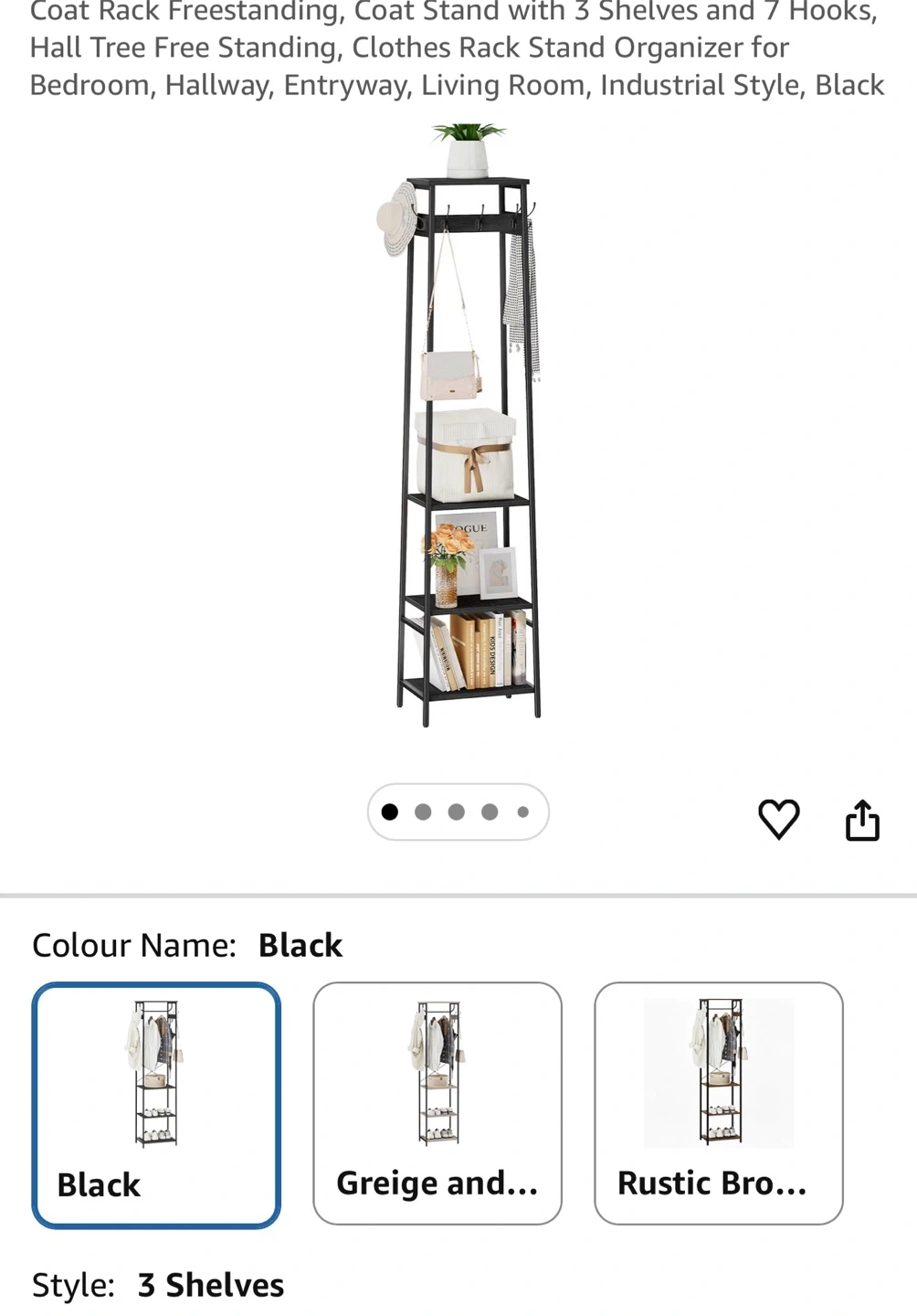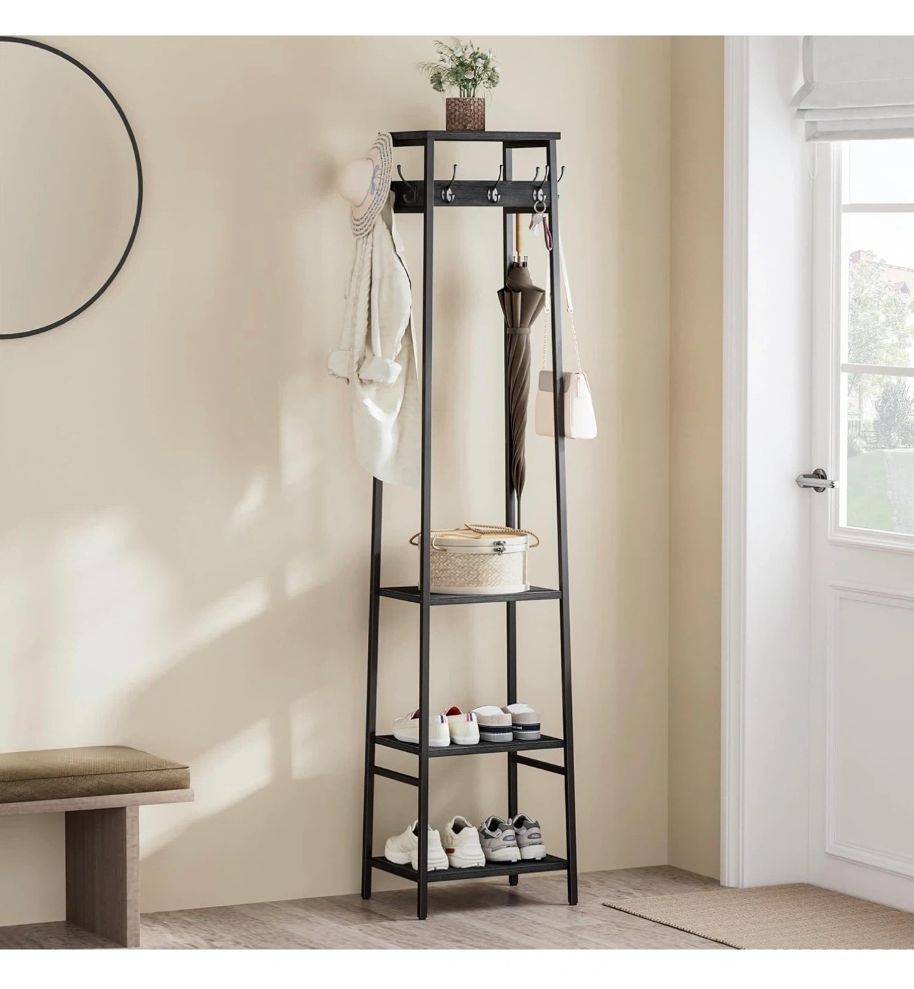 Black Freestanding Coat Rack with 3 Shelves and 7 Hooks