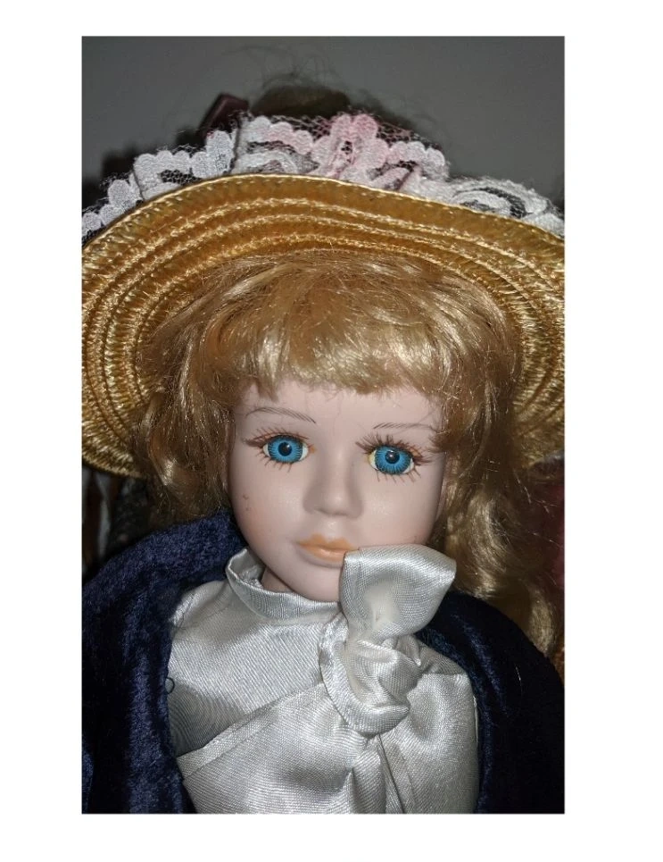 24This is a lovely porcelain doll with blonde hair, blue eyes, and a charming straw hat. She's wearing a satin-like dress with a navy blue jacket. A beautiful addition to any doll collection!