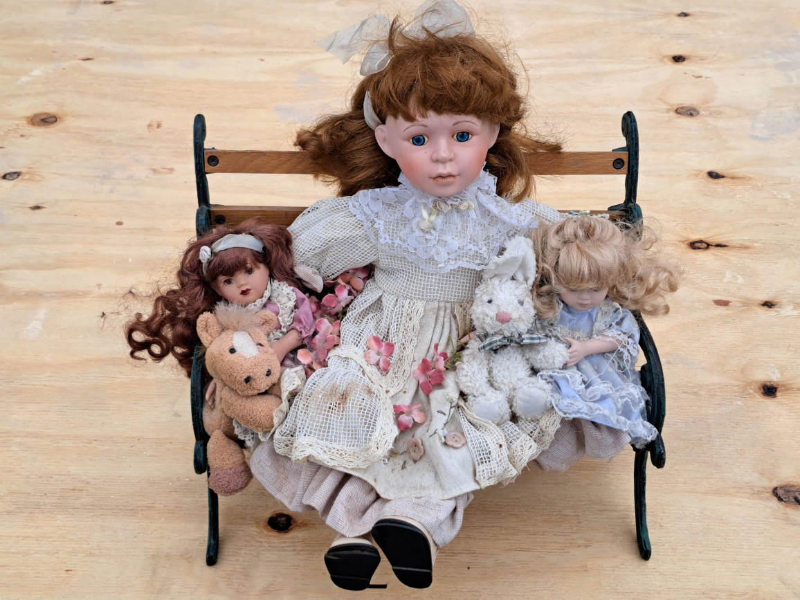 A group of porcelain dolls sitting on a miniature bench. The dolls have detailed features and are dressed in vintage-style clothing.