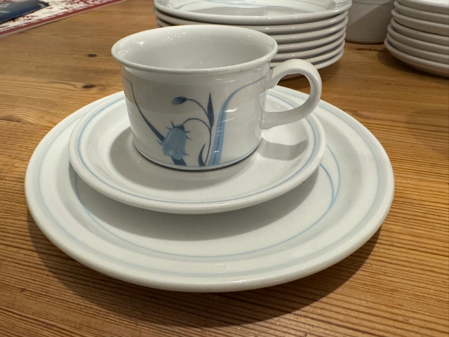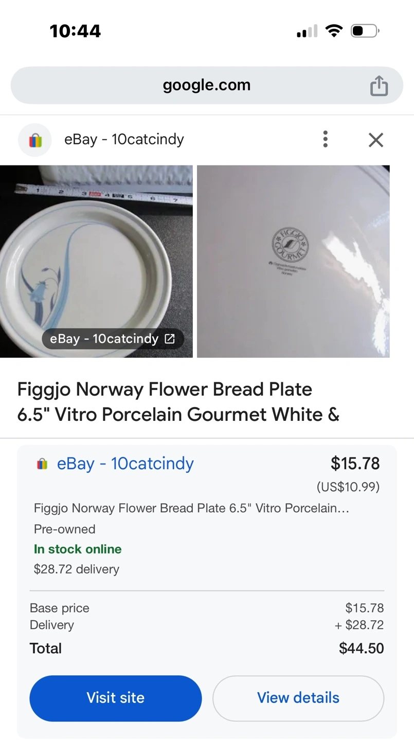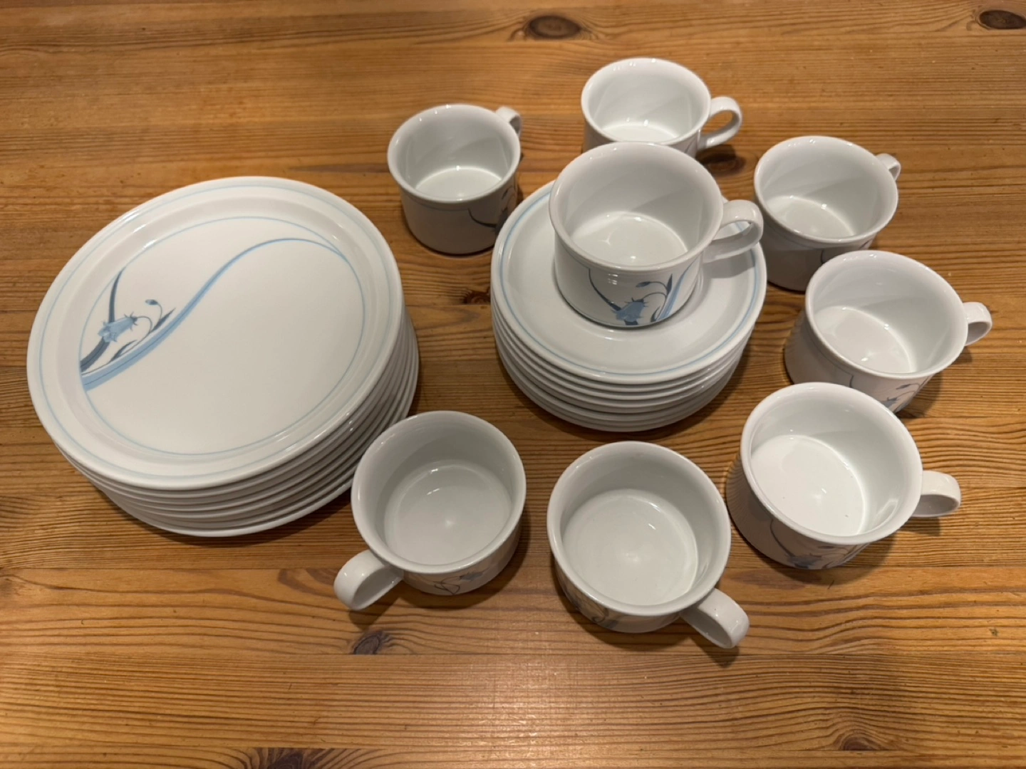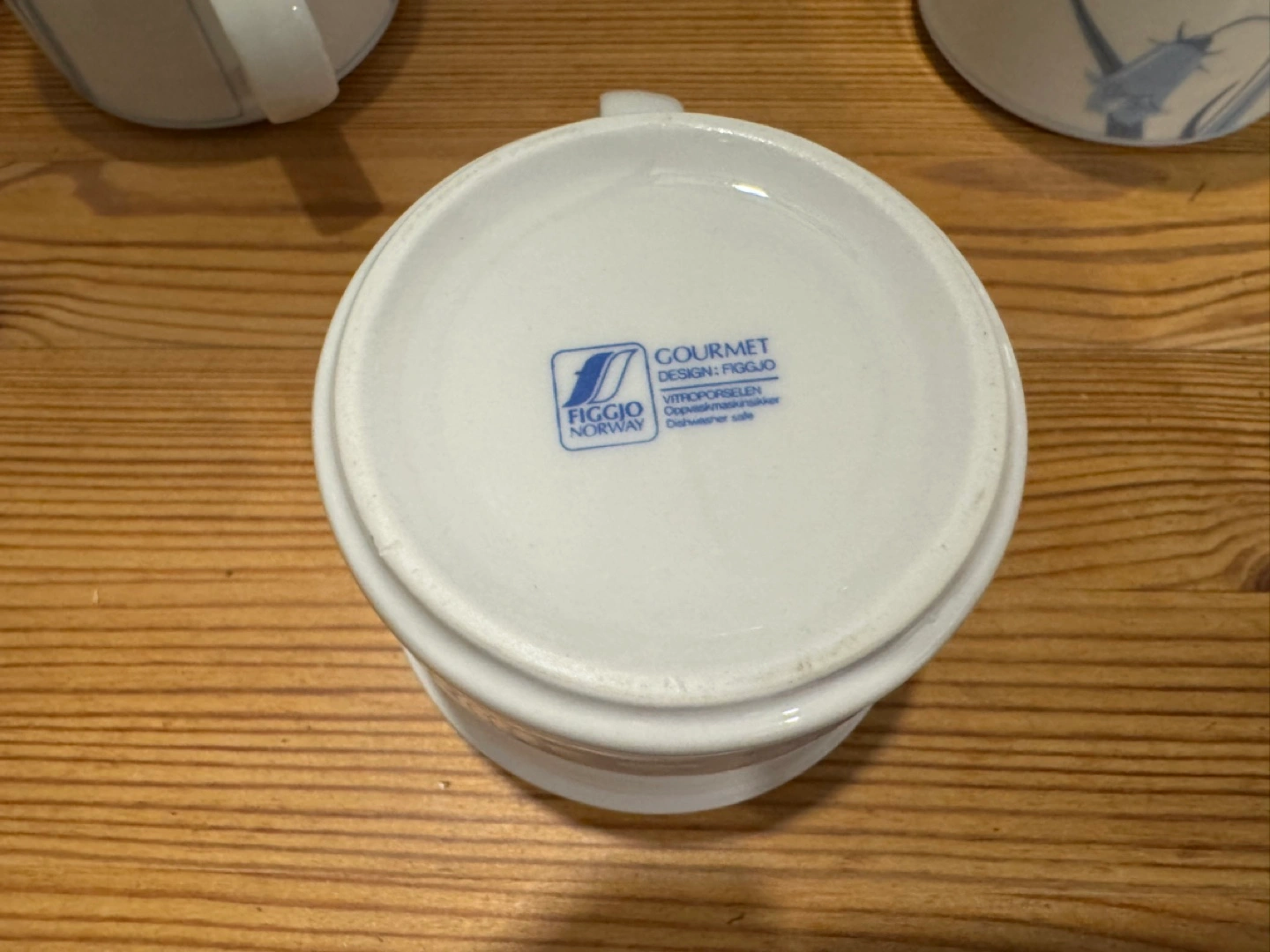 25Made in NORWAY, GOURMET FIGGJO BRAND Porcelain, Dishwater safe. 8 pcs Lunch plates, 8 inches 8 cups and 8 saucers Saucers can be used as snack plates too. Ideal for Breakfast or Lunch. Never used, as good as new.Mint condition Vintage Norwegian Series selling on EBAY for a very high price per piece Set of 8 cups and saucers and 8 lunch/dinner plates. Blue floral design.