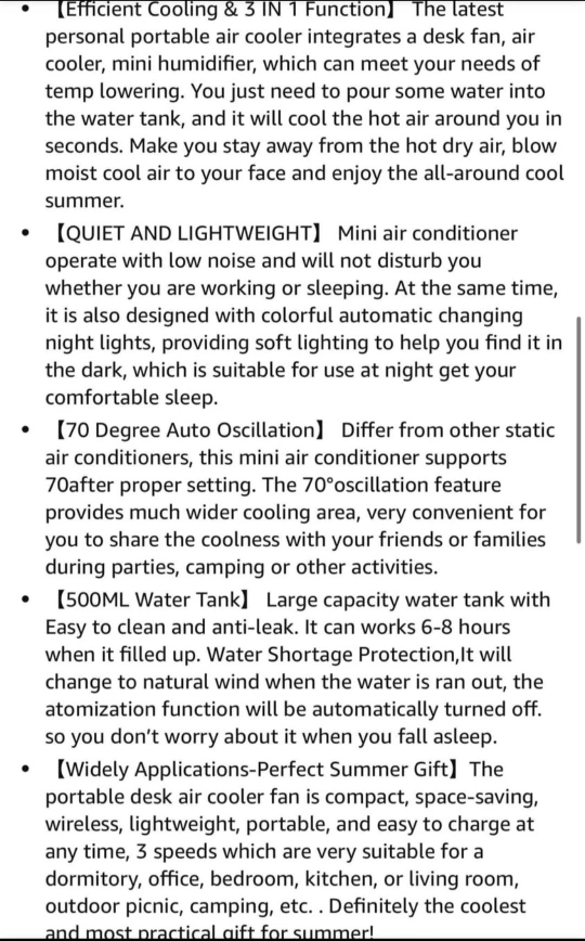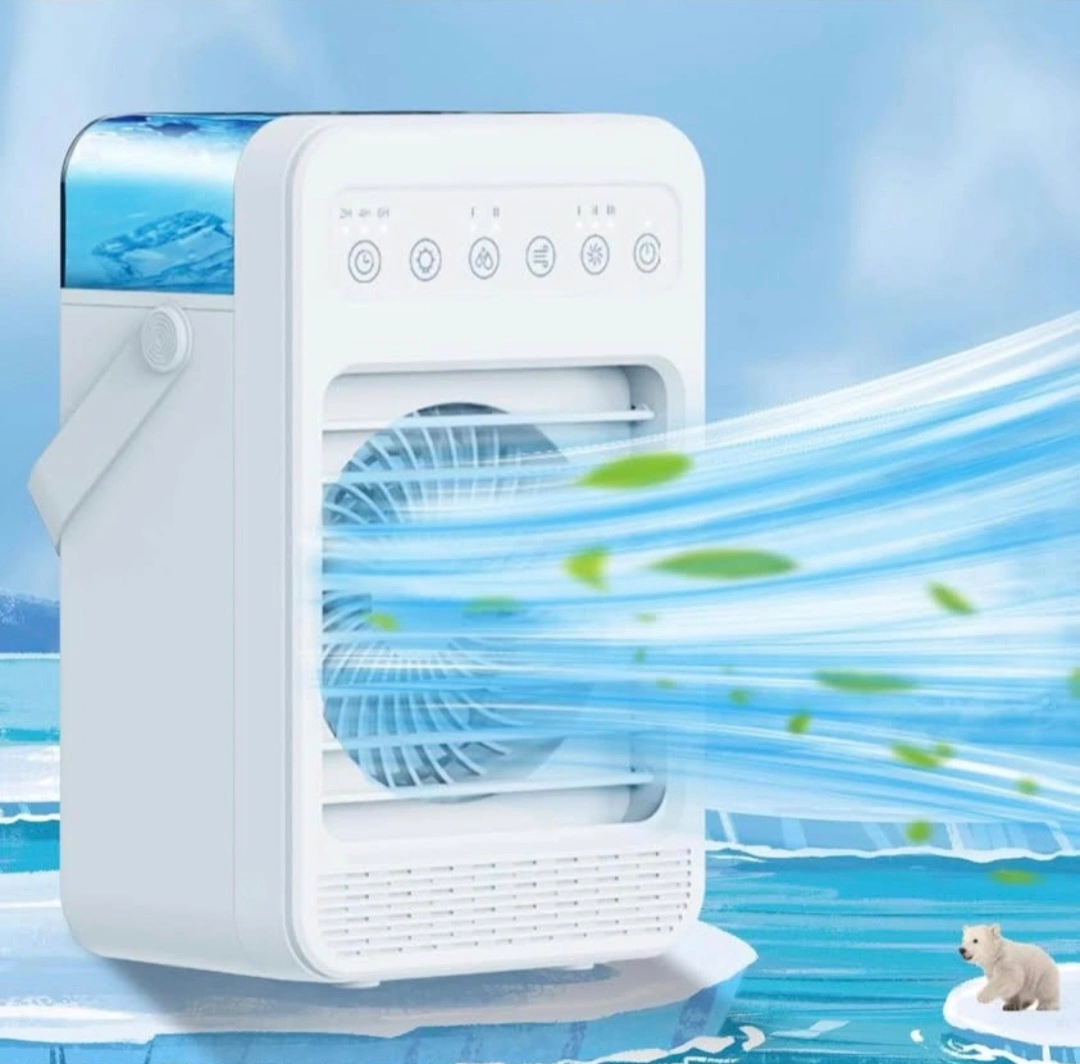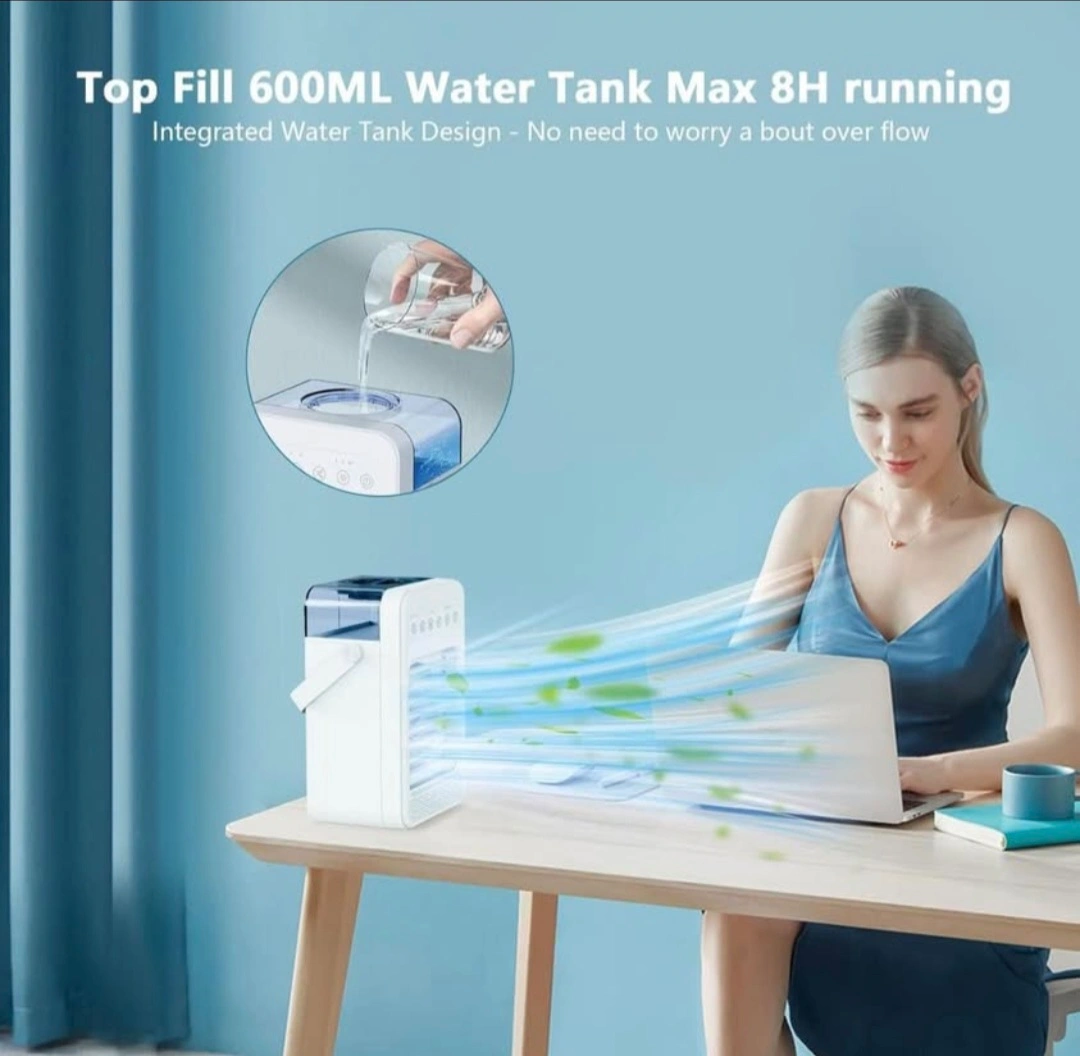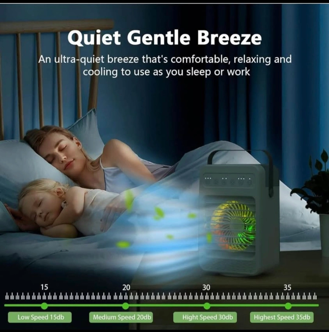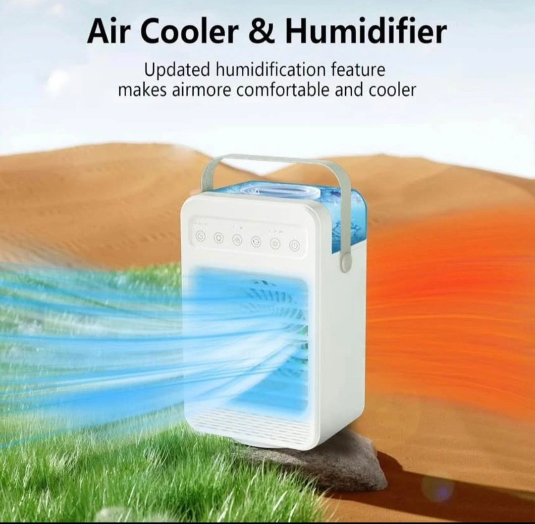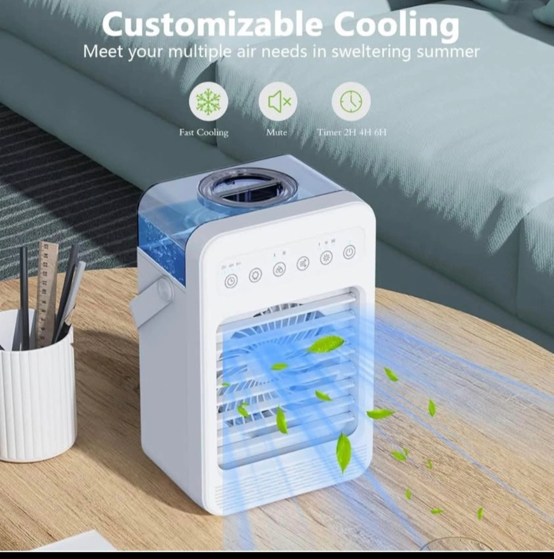 55Small portable air cooler and humidifier. Features include: customizable cooling, quiet gentle breeze, top fill water tank, timer and colorful LED lights