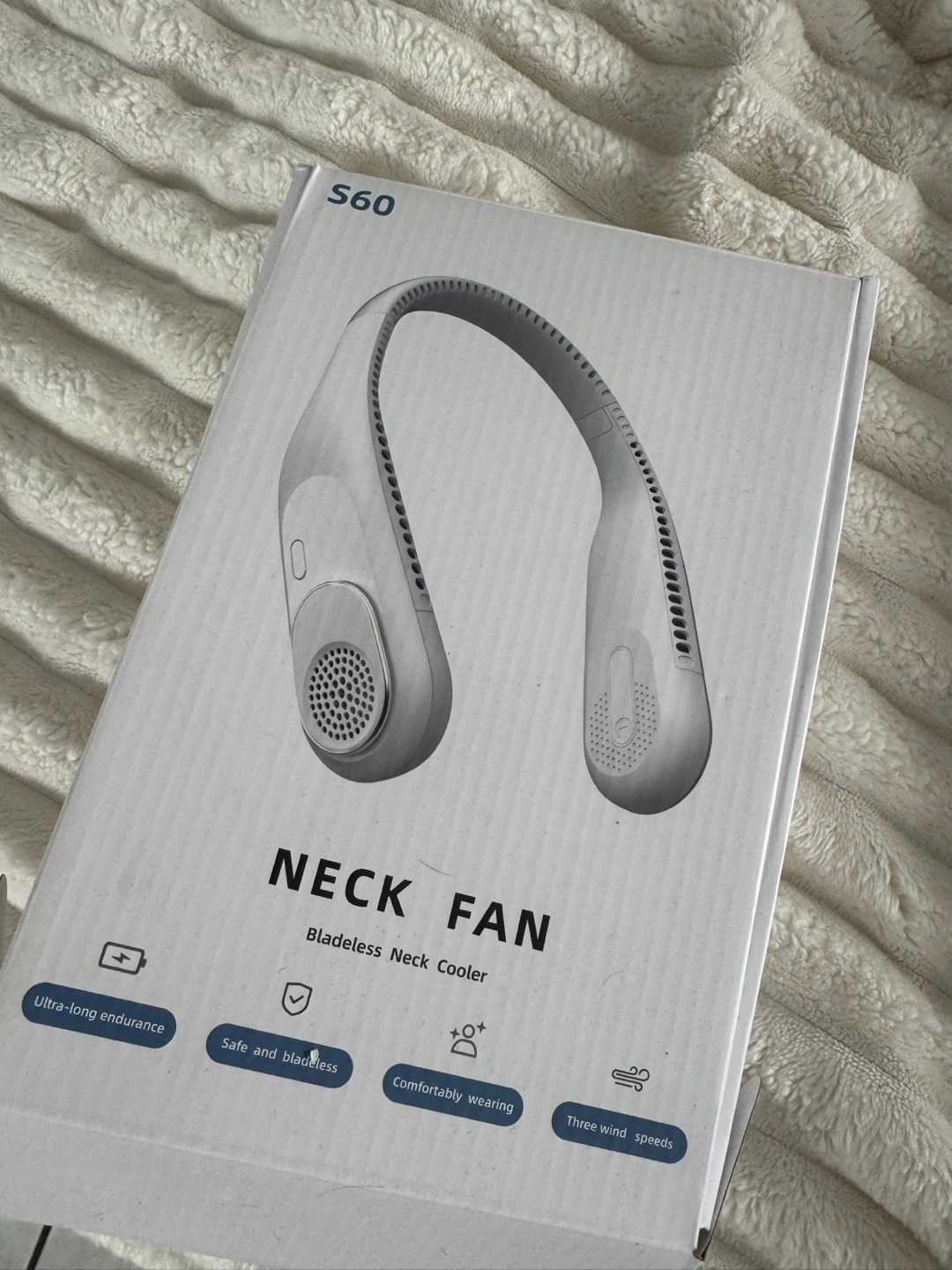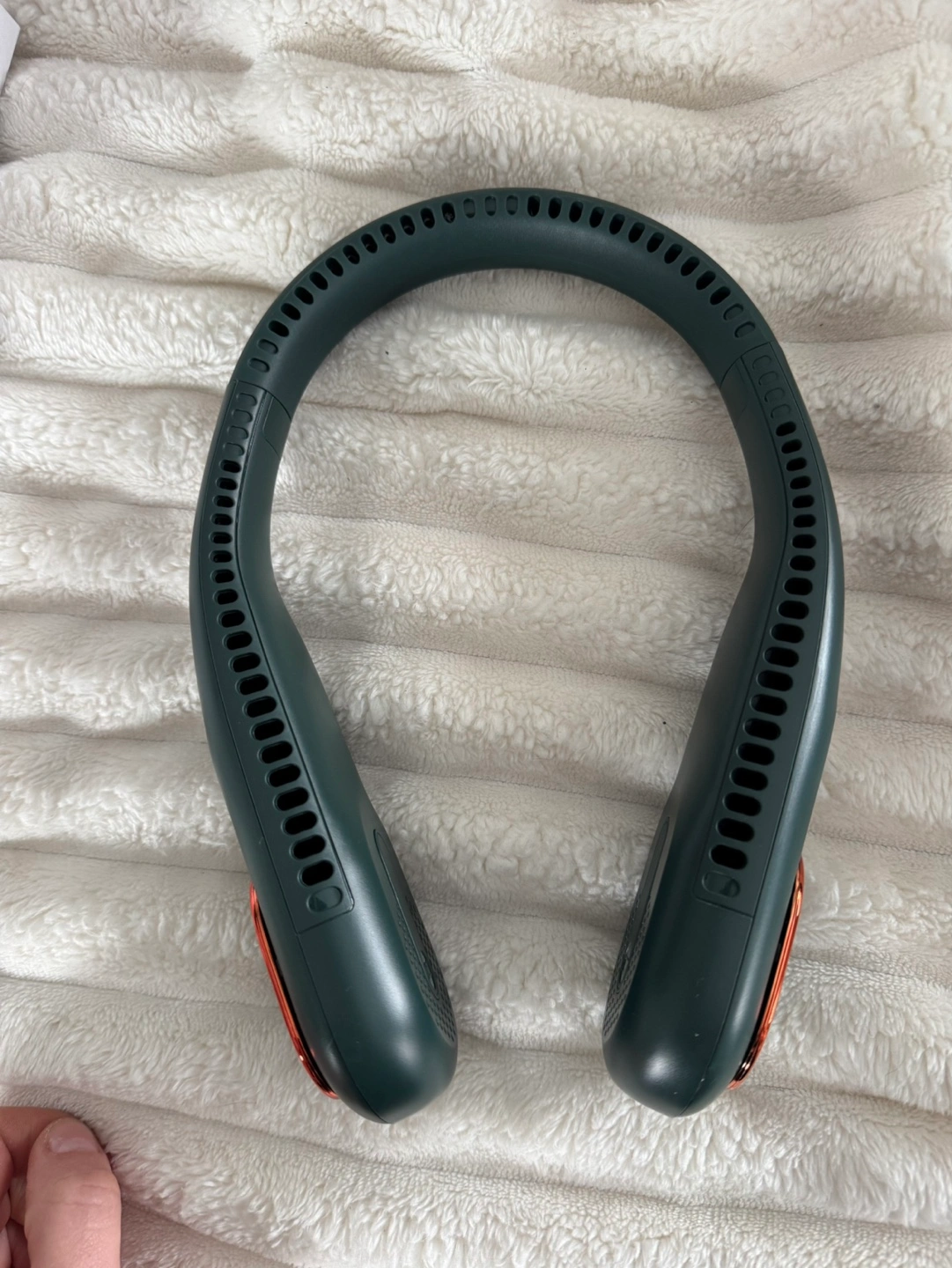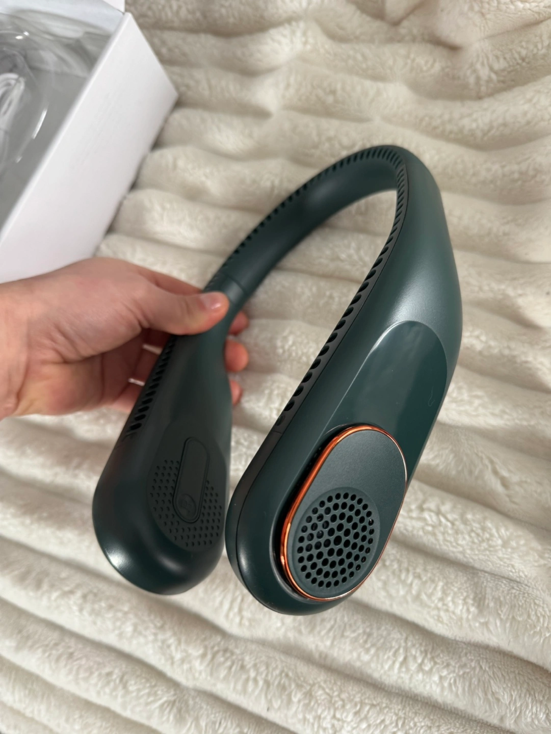 Brand new blade-less neck fan - perfect for vacation. Portable, lightweight and rechargeable. Comfortable to wear.