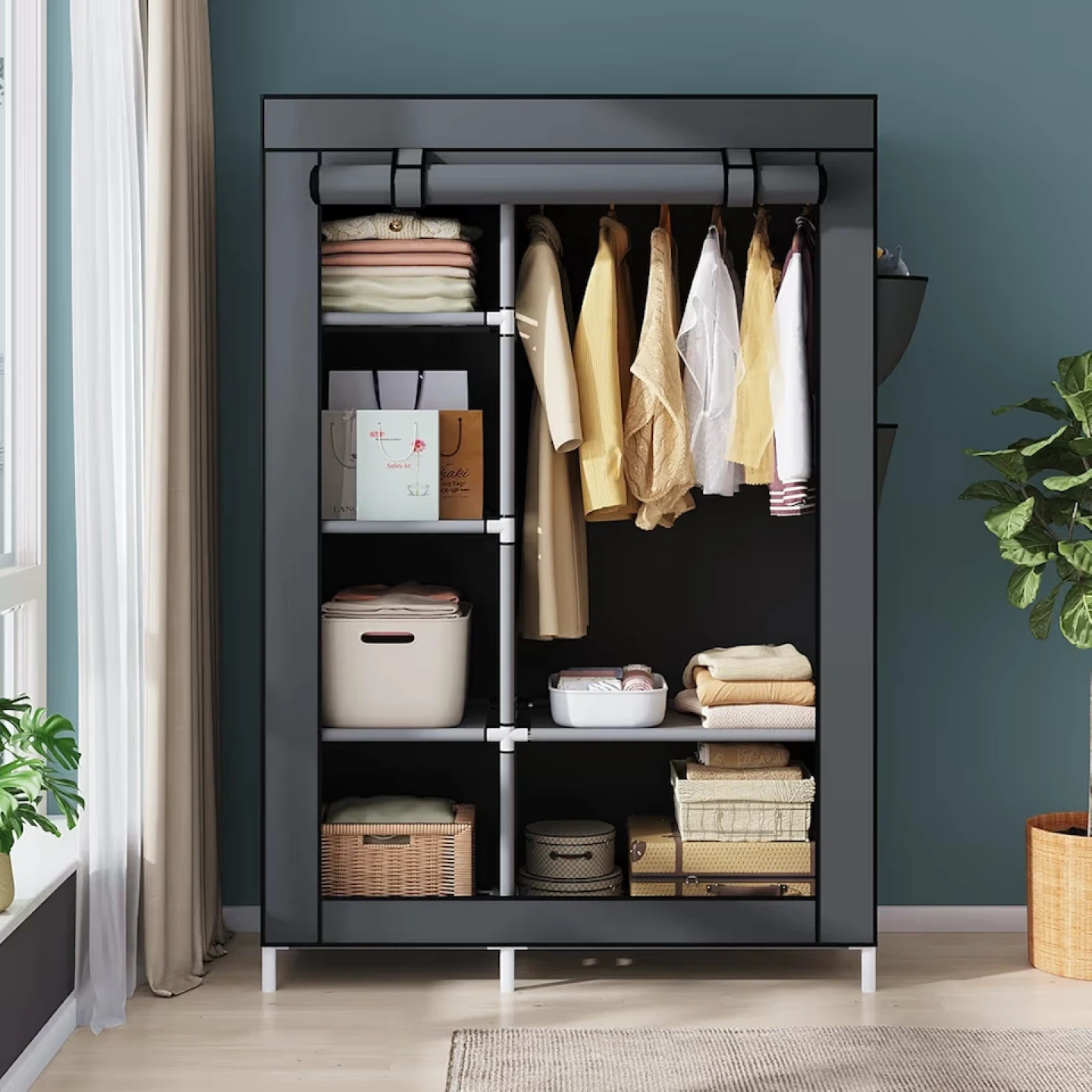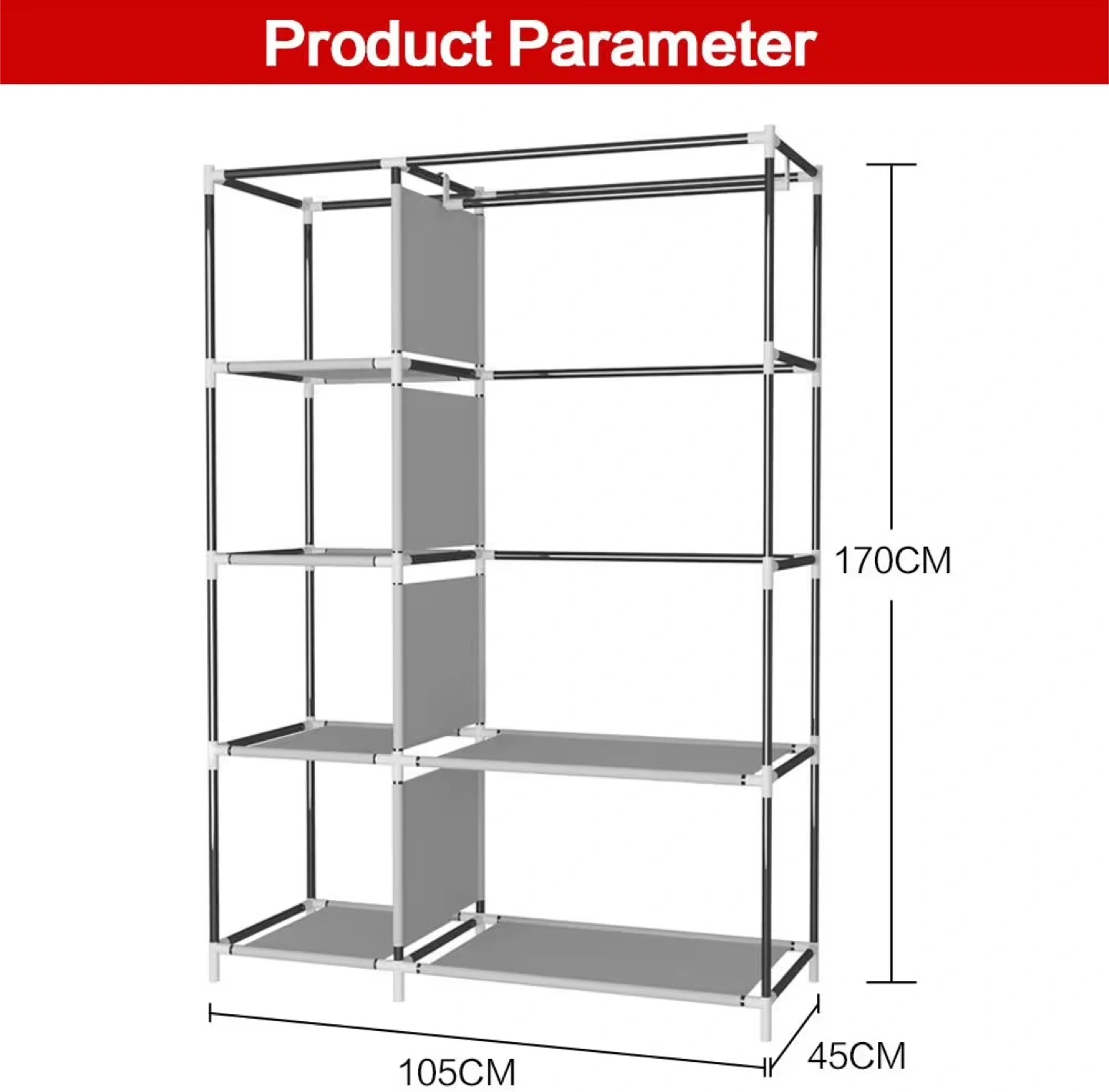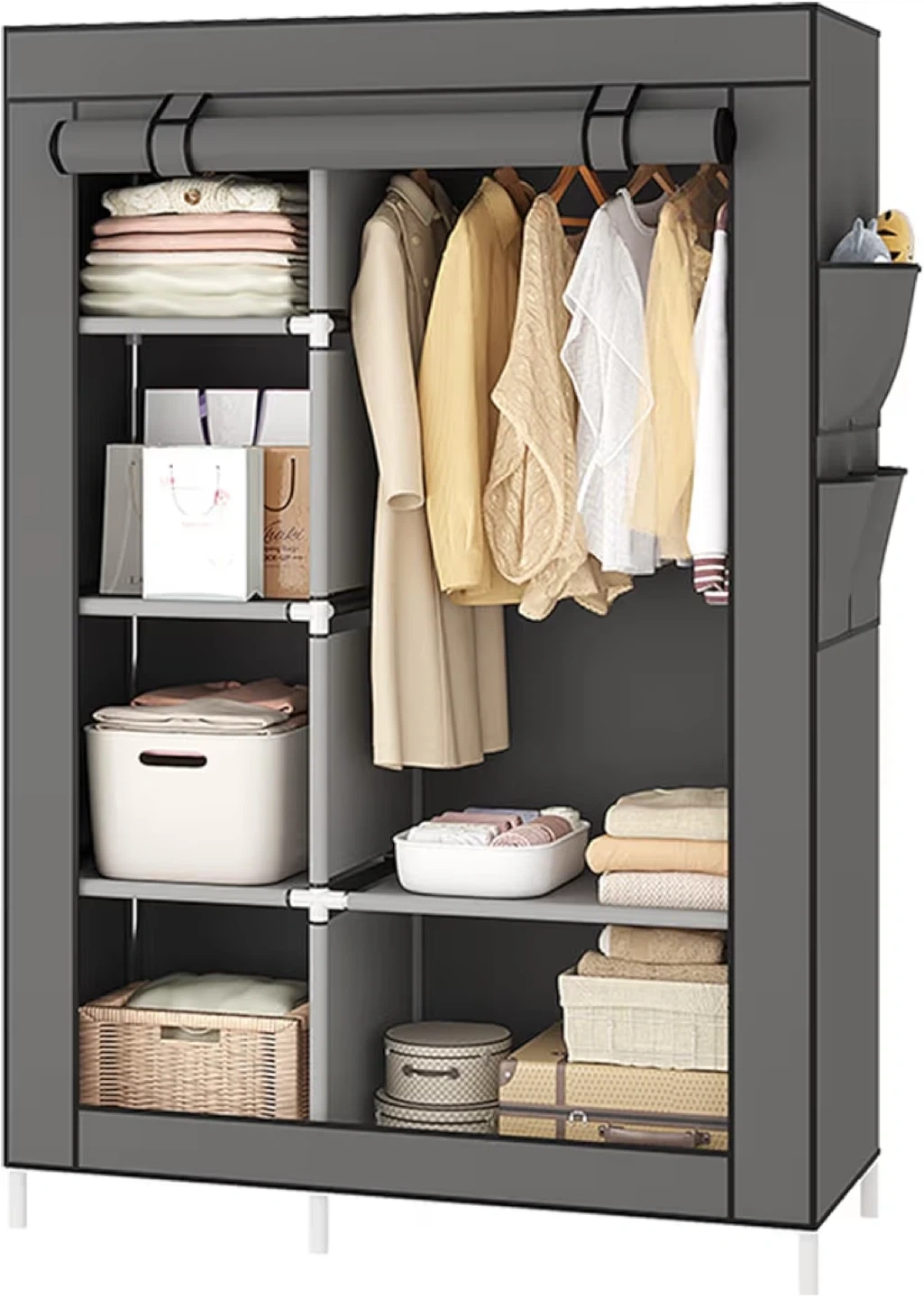 23Looking to organize your clothes? This portable wardrobe is just what you need! It features multiple shelves and a hanging rod, providing ample space for your clothes, accessories, and more. It also has side pockets for extra storage. Dimensions are approximately 170cm tall, 105cm wide, and 45cm deep.