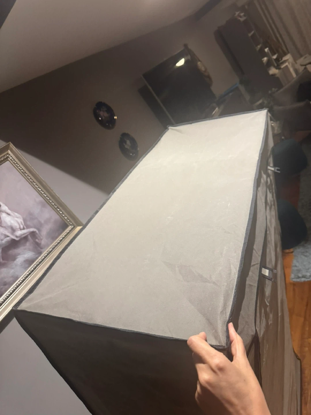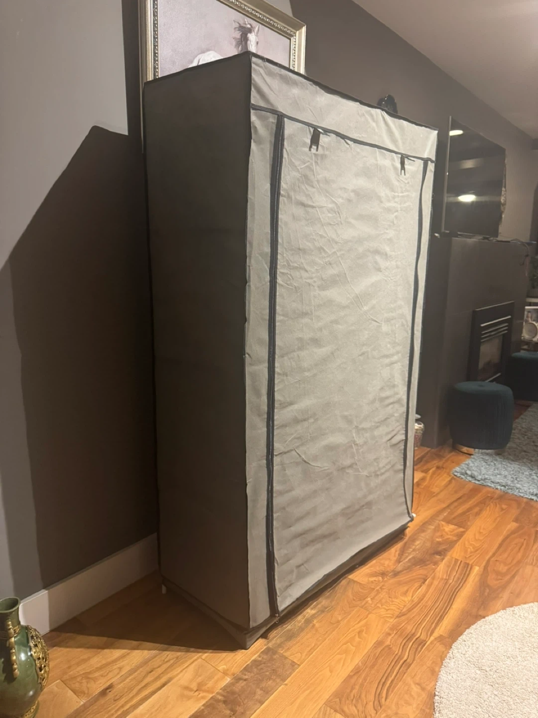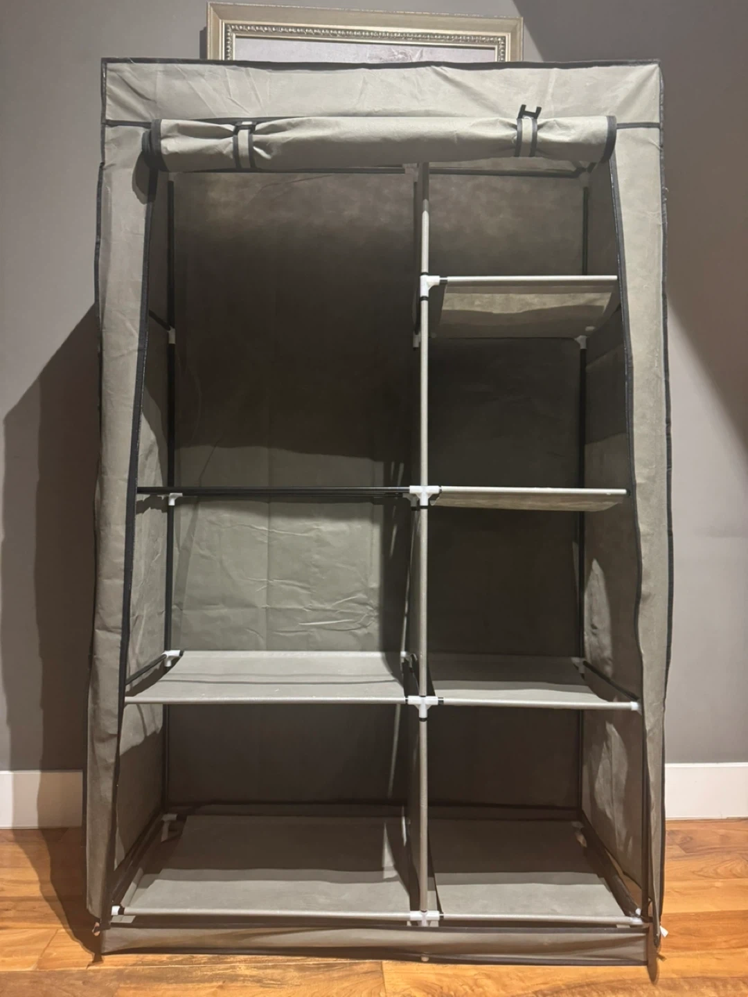 23Looking to organize your clothes? This portable wardrobe is just what you need! It features multiple shelves and a hanging rod, providing ample space for your clothes, accessories, and more. It also has side pockets for extra storage. Dimensions are approximately 170cm tall, 105cm wide, and 45cm deep.