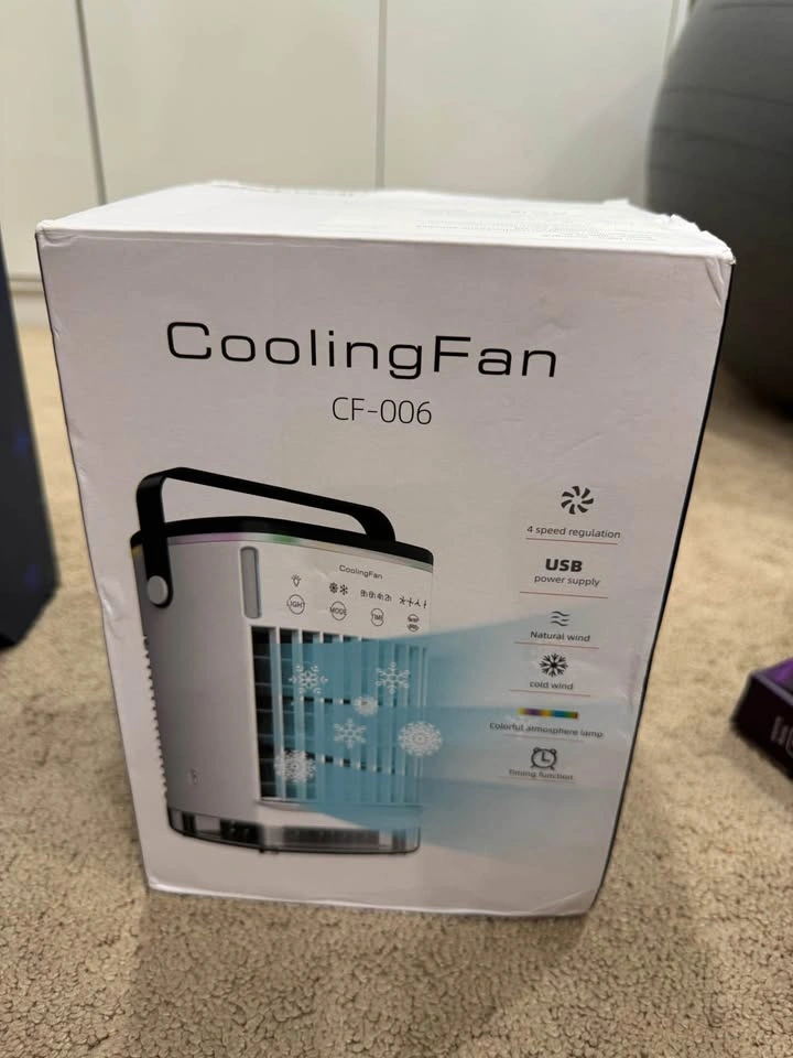 This personal air cooler has a 700ml water tank and 4 fan speeds. It features double ultrasonic atomizer and wet curtain triple refrigeration for a refreshing airflow. It also has a 4 timing function (2-4-6-8H) and 7 LED mood lights that can be used as a night light. It's USB powered. Includes the fan, USB cable, and manual. Pick up - Courtice Please check my other listings!