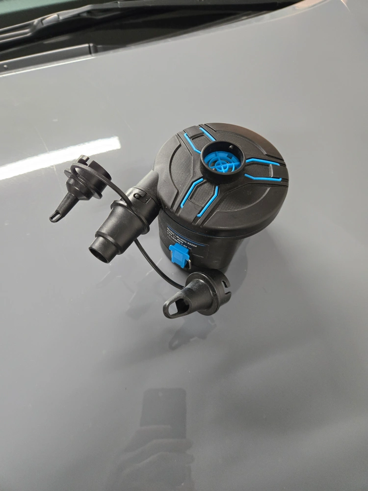 Inflatable pump. Features multiple nozzles. Compact and easy to store.