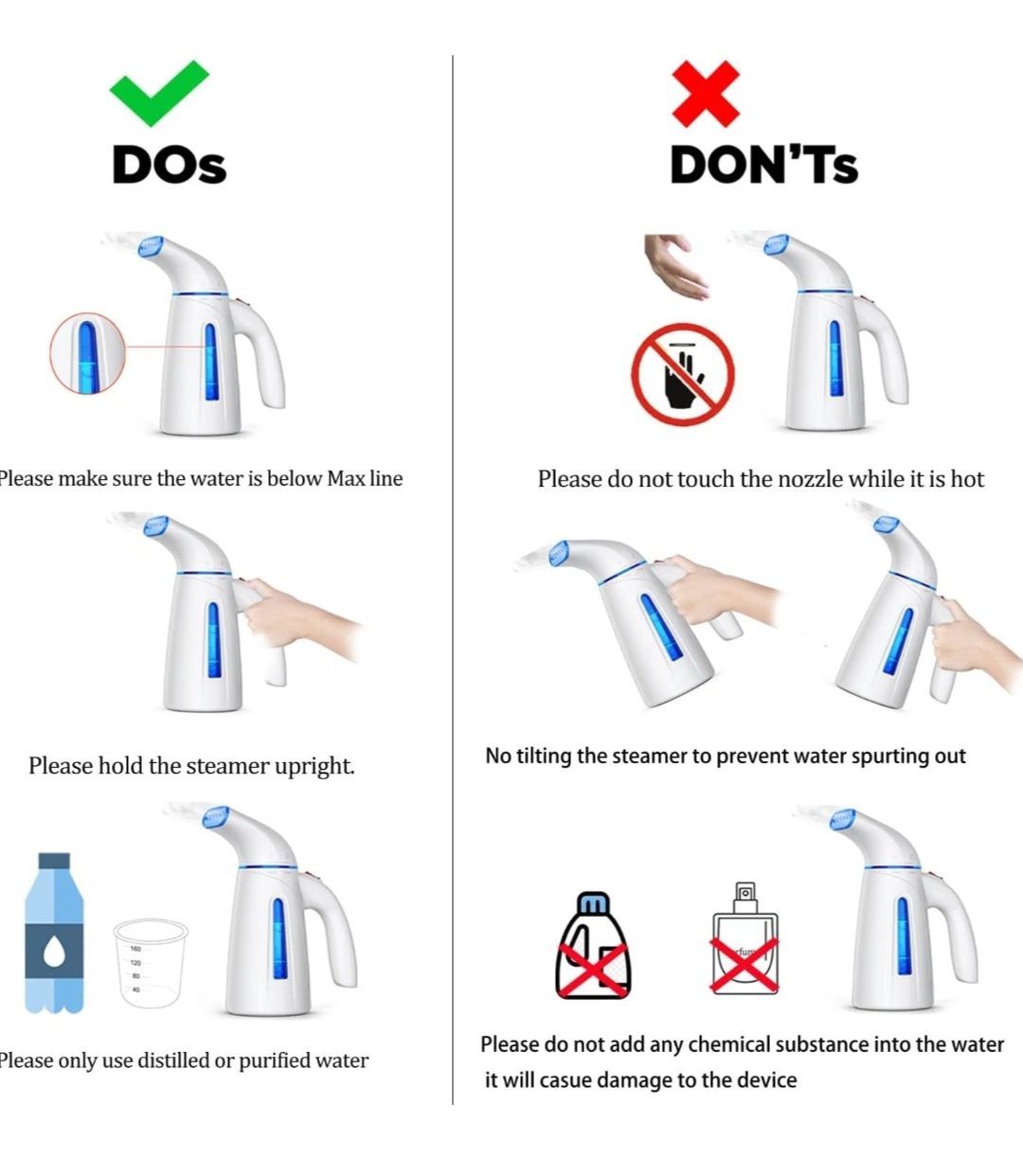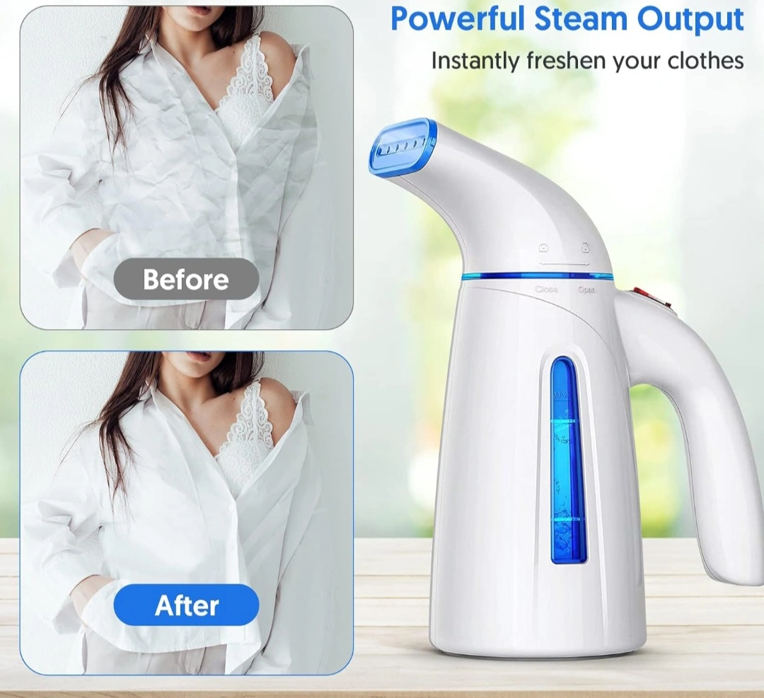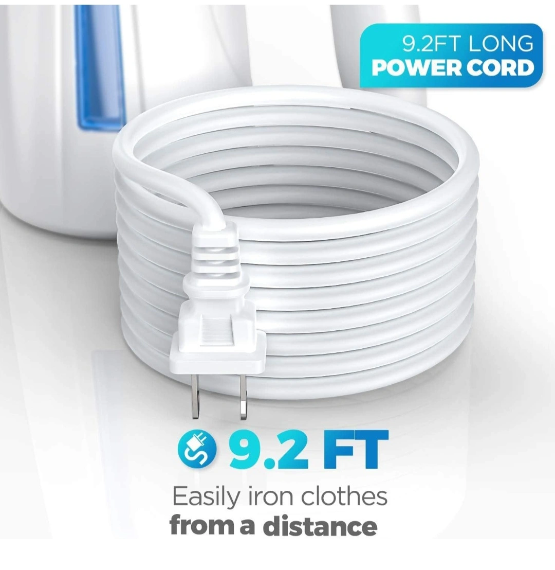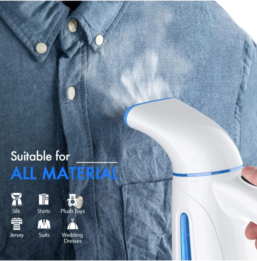 Powerful handheld garment steamer. Features a 15-minute run time and 9.2ft power cord. Use only distilled or purified water. Suitable for various materials including silk, shirts, plush toys, jerseys, suits, and wedding dresses. Includes 3-year warranty and overheating protection. 120V only.