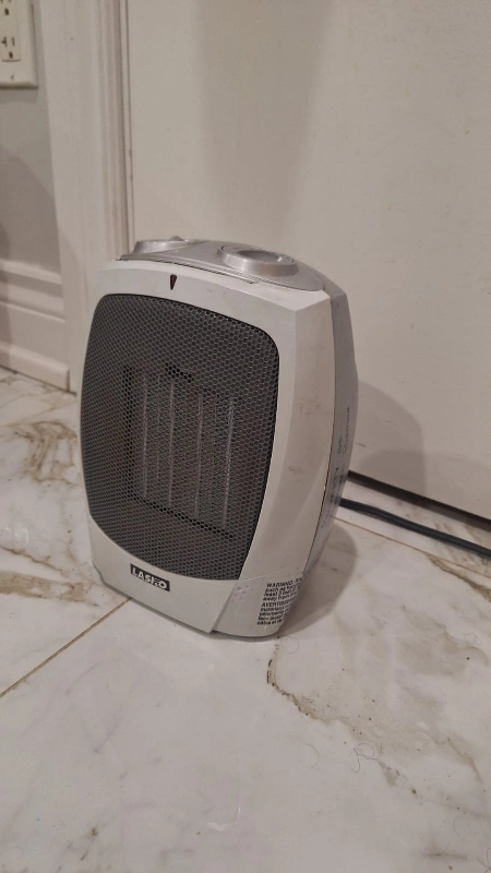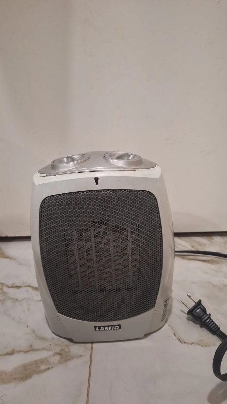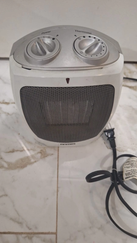 Small ceramic electrical portable heater with two heat settings and a thermostat. Includes a power cord. 1500W, used for only 2 months. working very good.