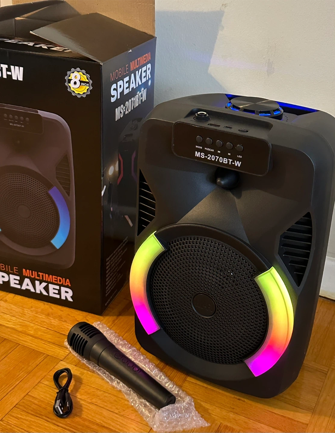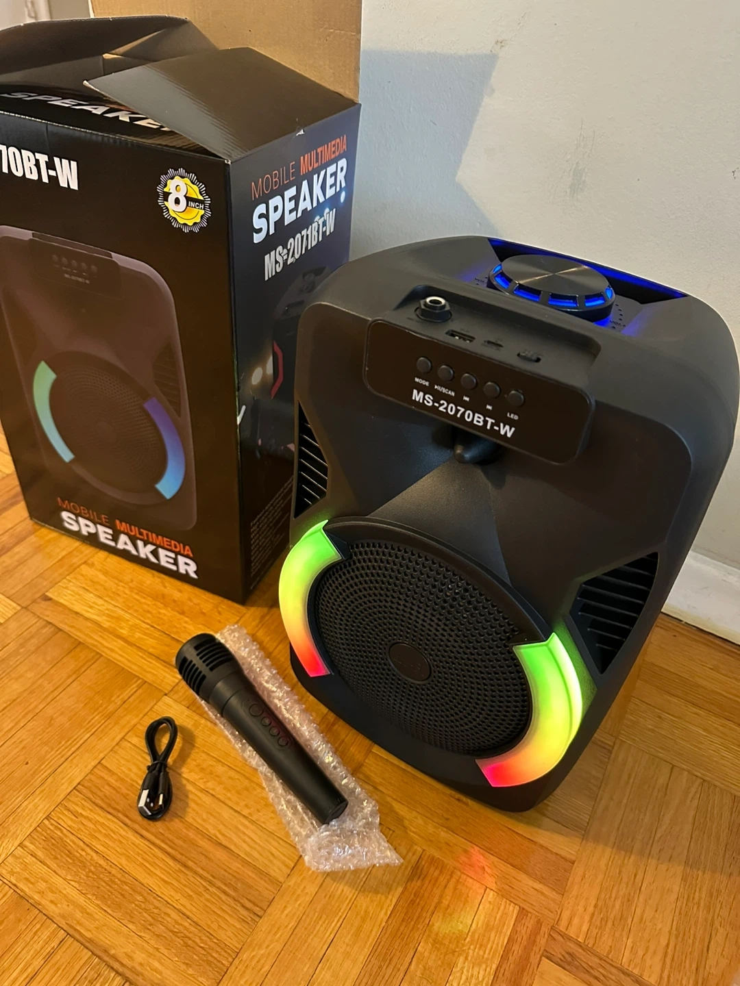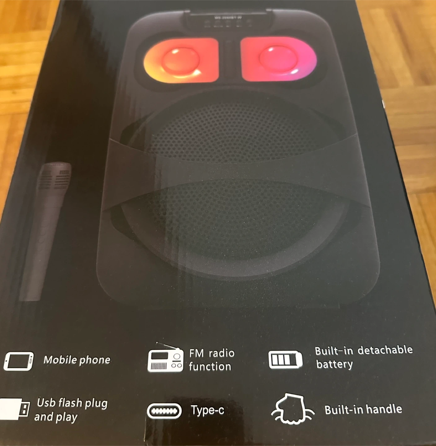 459New with the Box. internal subwoofer that provides impressive bass power. High capacity lithium battery, with RGB light show, FM radio function, and touch function with MP3/USB. It also includes a wireless microphone speaker unit. The power supply is a 25W battery. Comes with a built-in detachable battery, USB flash plug and play, Type-C, and a built-in handle. Includes the box and microphone!