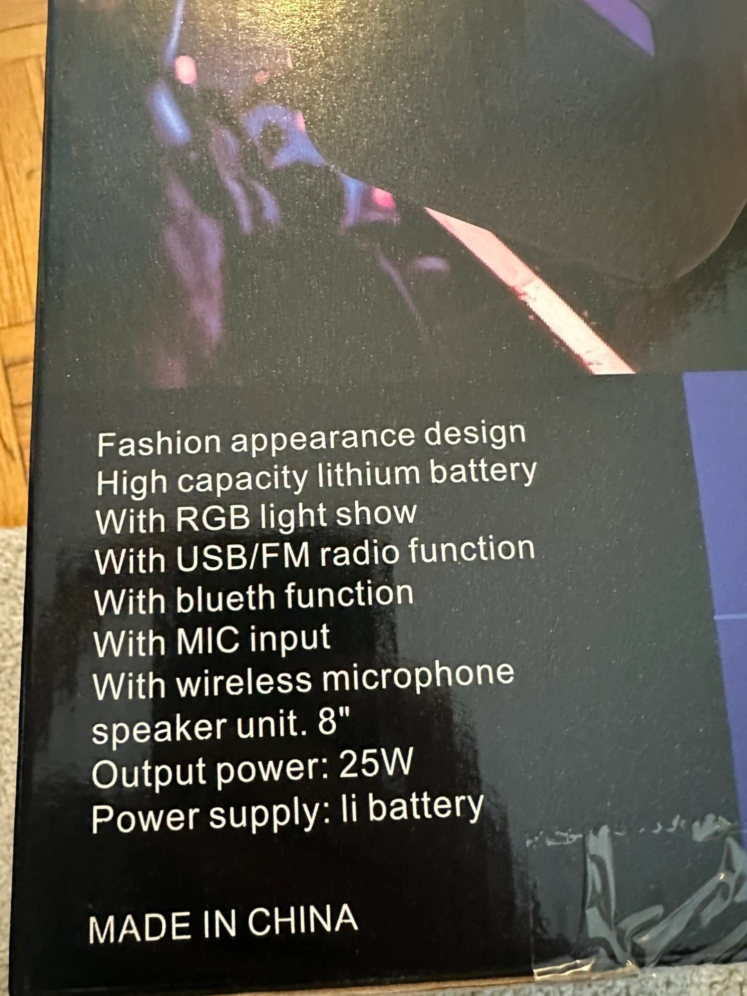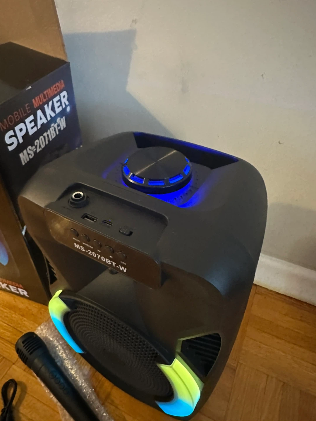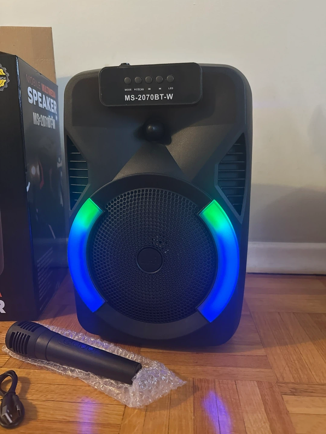 459New with the Box. internal subwoofer that provides impressive bass power. High capacity lithium battery, with RGB light show, FM radio function, and touch function with MP3/USB. It also includes a wireless microphone speaker unit. The power supply is a 25W battery. Comes with a built-in detachable battery, USB flash plug and play, Type-C, and a built-in handle. Includes the box and microphone!