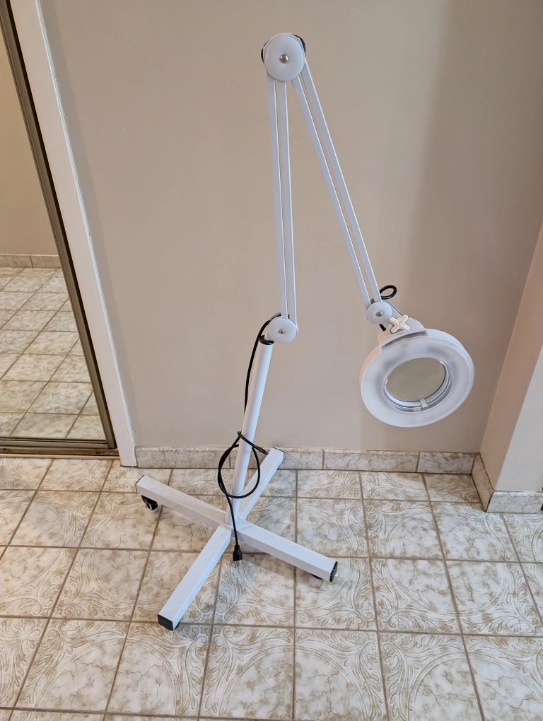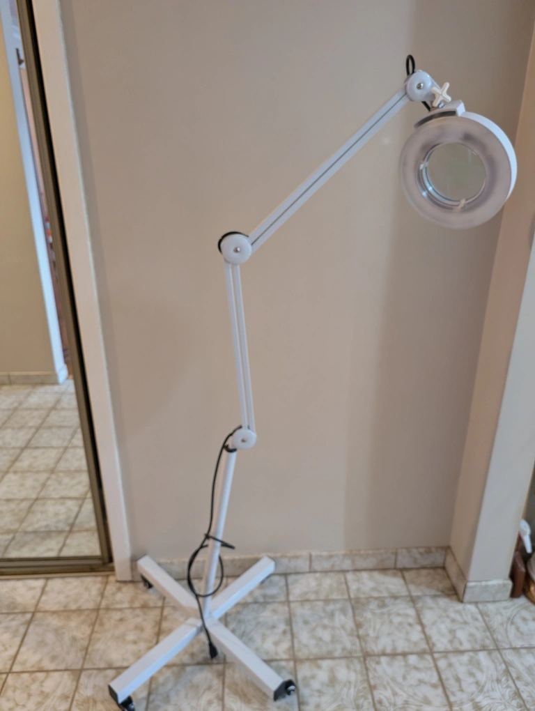 213Portable Floor lamp with magnifying glass and light and adjustable arm. Has wheels for easy movement. White.