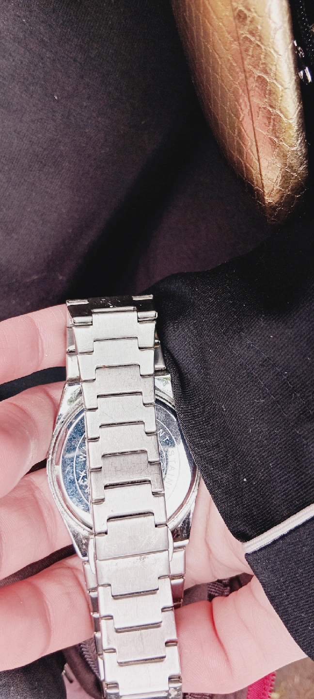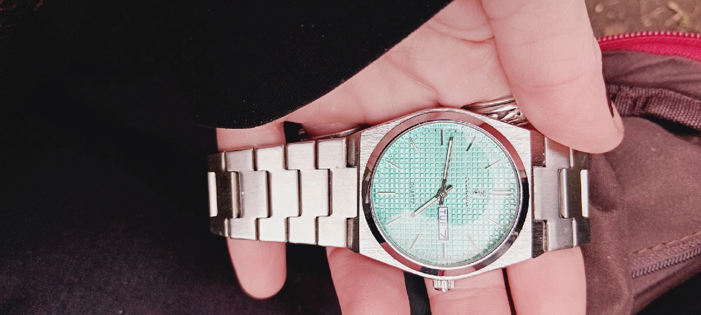 Selling a Portagar Quartz watch with a silver-tone finish. The watch face has a cool, textured teal colour. It displays the day and date. It's in good condition and ready to wear!
