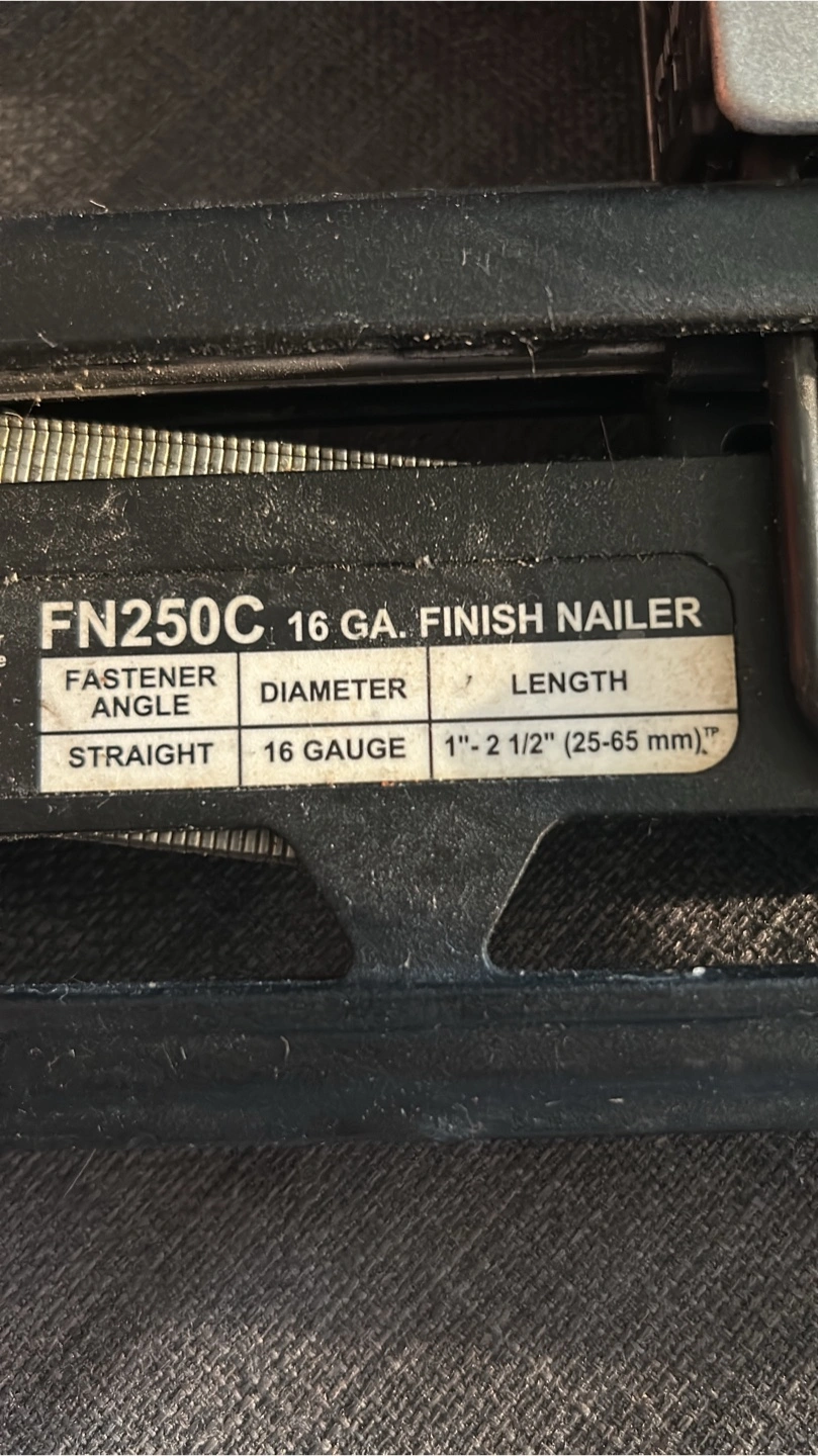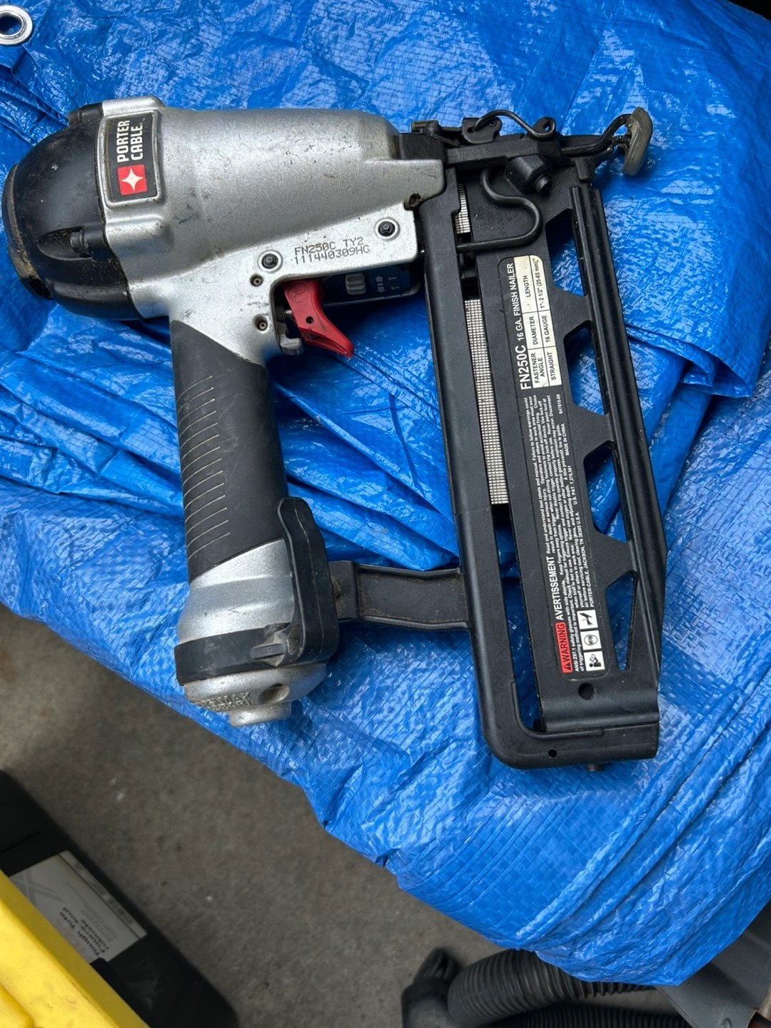 A pneumatic nail gun with a silver and black body. Features a red trigger, and a black magazine. This nailer will make your projects feel much easier. Make an offer