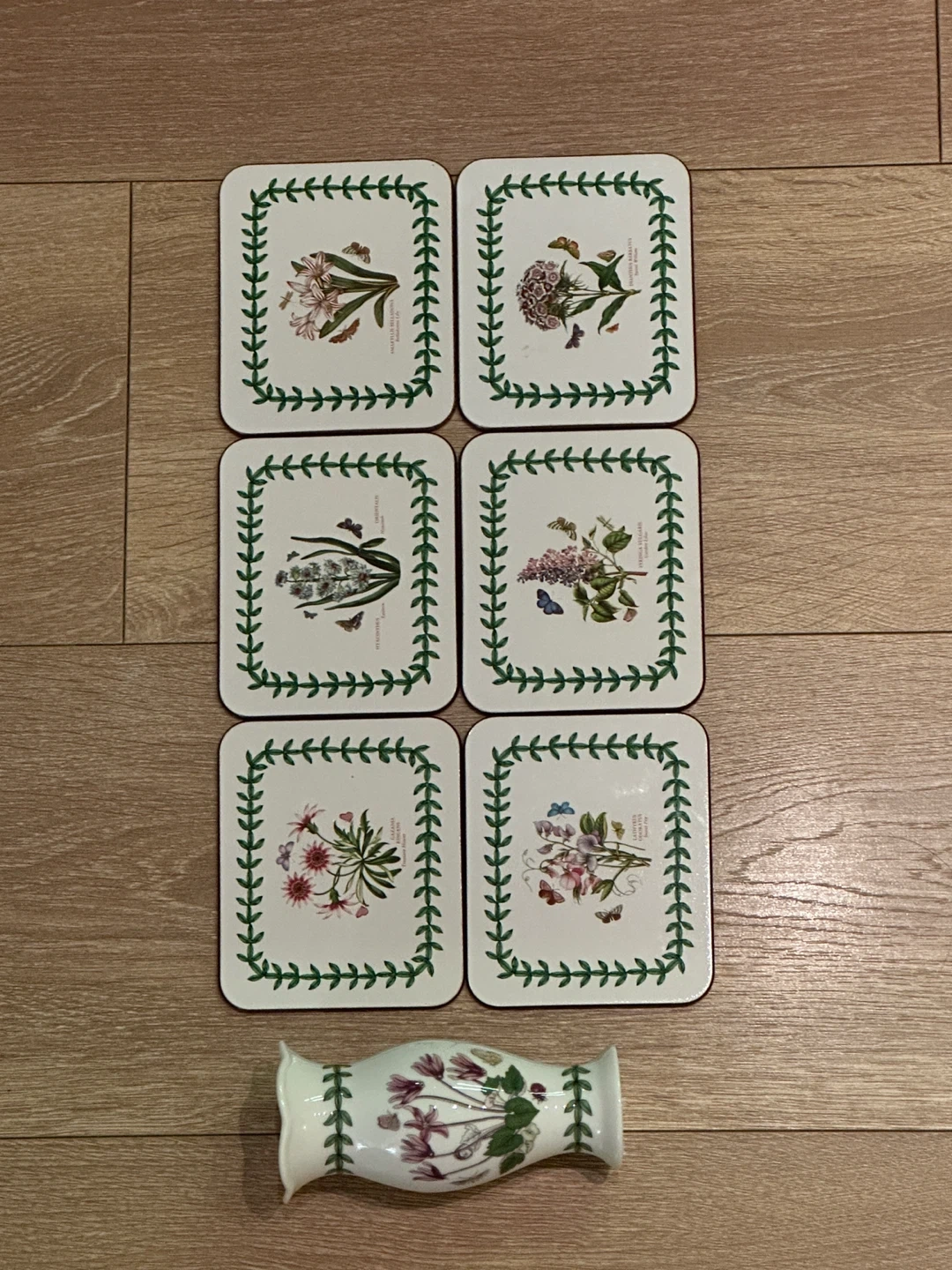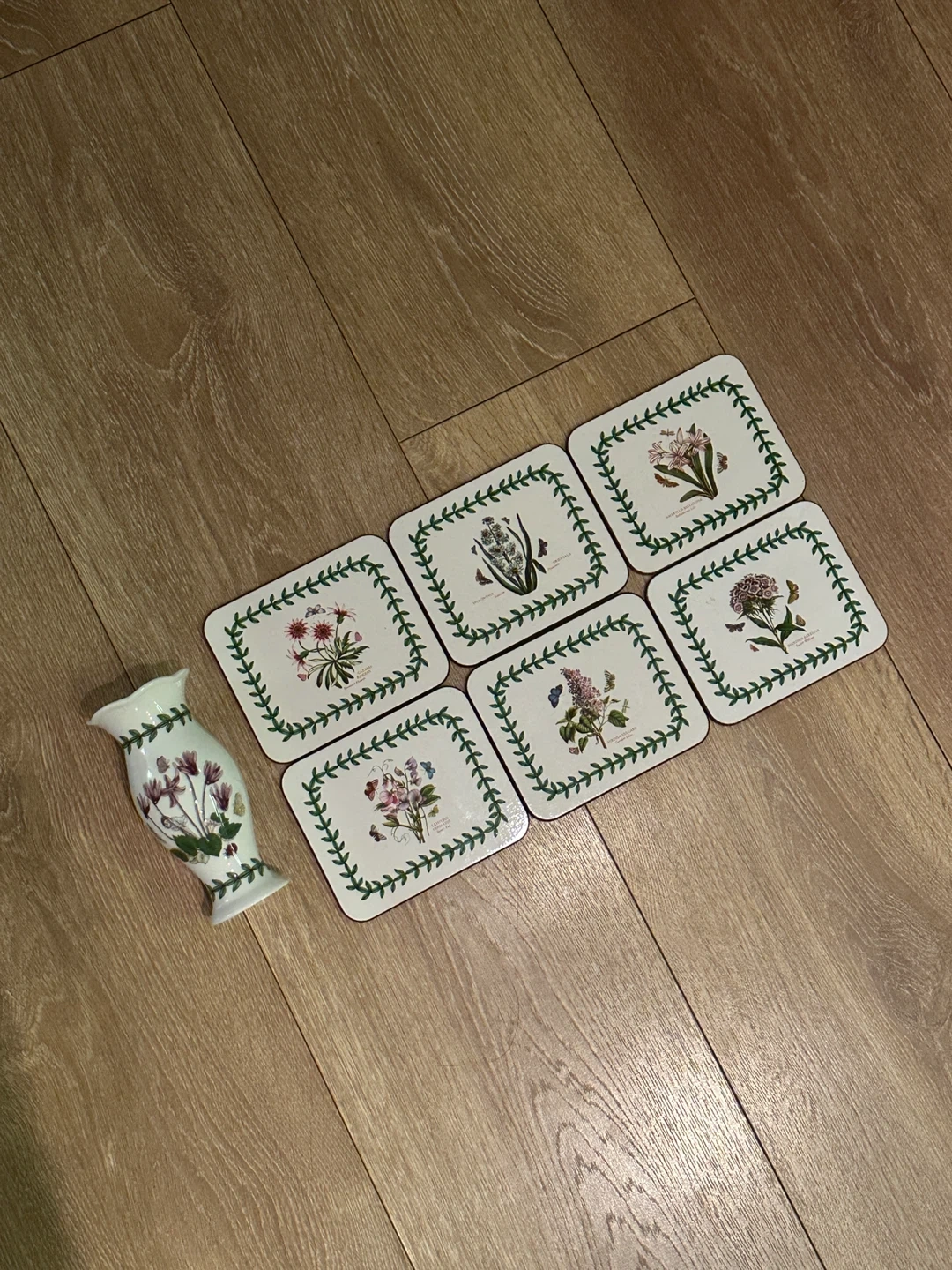 Selling a set of Portmeirion Botanic Garden coasters and a matching vase. The coasters feature different botanical illustrations with a green border, and the vase complements the set with similar floral designs. Perfect for adding a touch of nature to your home decor!