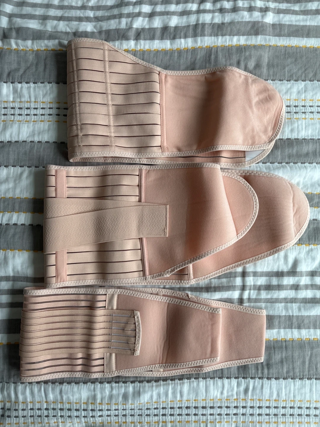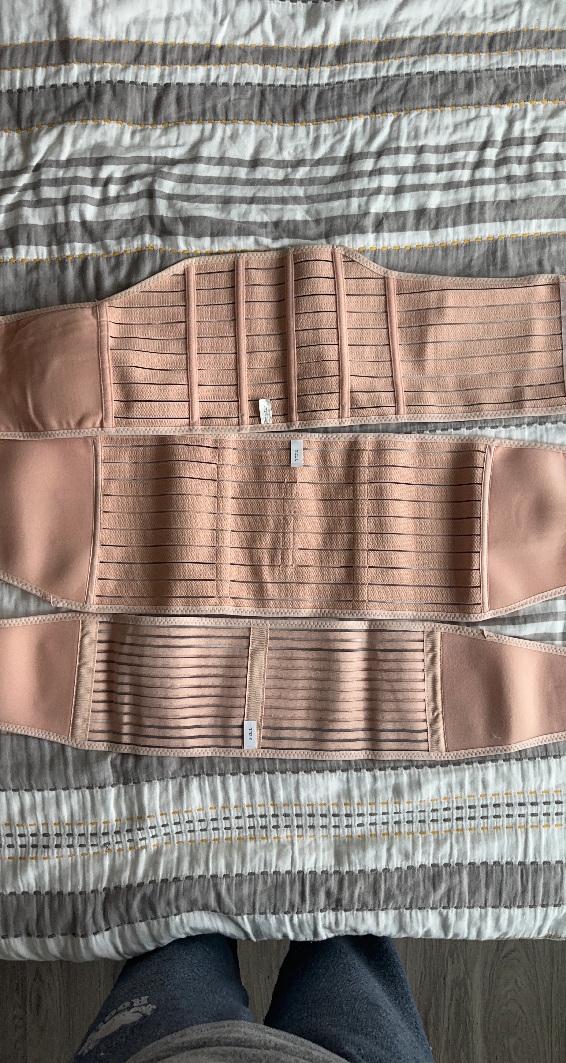 Selling a postpartum belly wrap set, includes 3 pieces to help with recovery after childbirth. The wraps is only tried on once so nearly new. They provide support for your abdomen and back. Size is L but feels like M. Instruction to use is universal for any 3 pieces of belly support, available online.