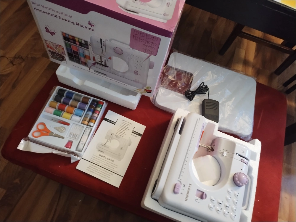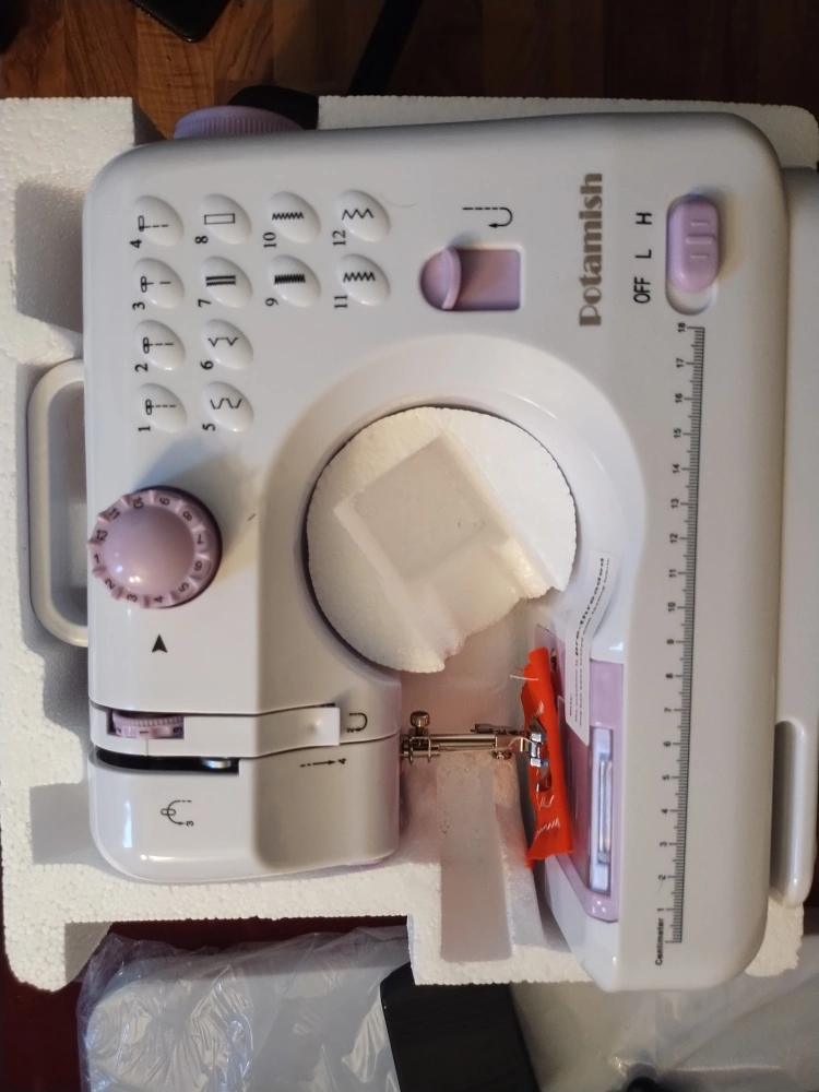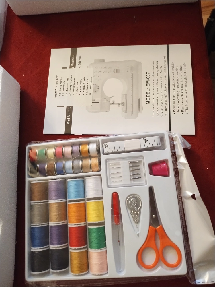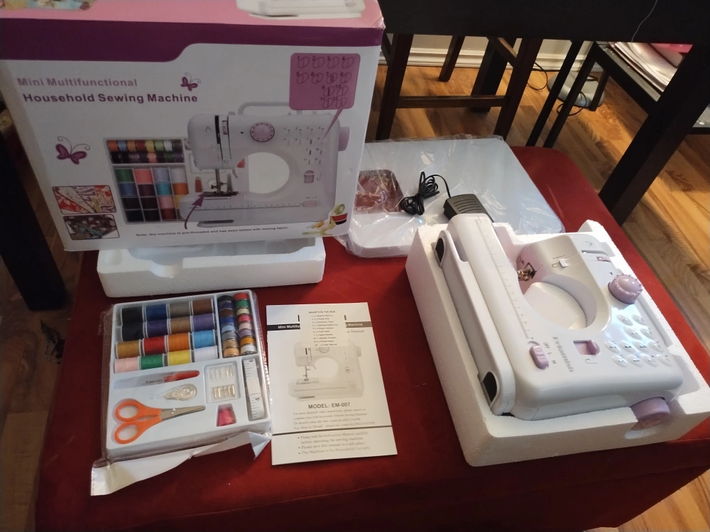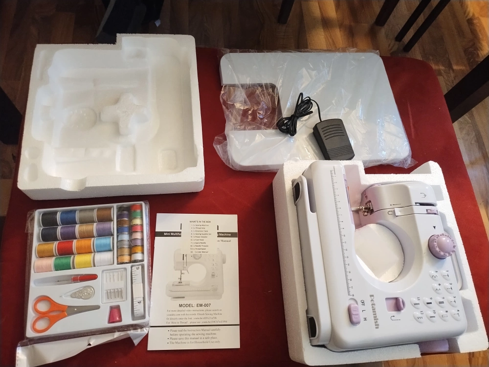 Selling a Potamish Mini Multifunctional Household Sewing Machine, model EM-007. It's in new condition and comes with all the original components and packaging! This compact machine is perfect for small sewing projects and easy to store. Included are various accessories to get you started right away