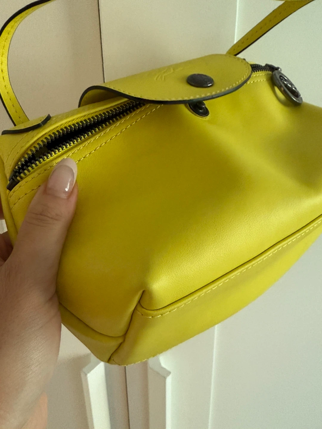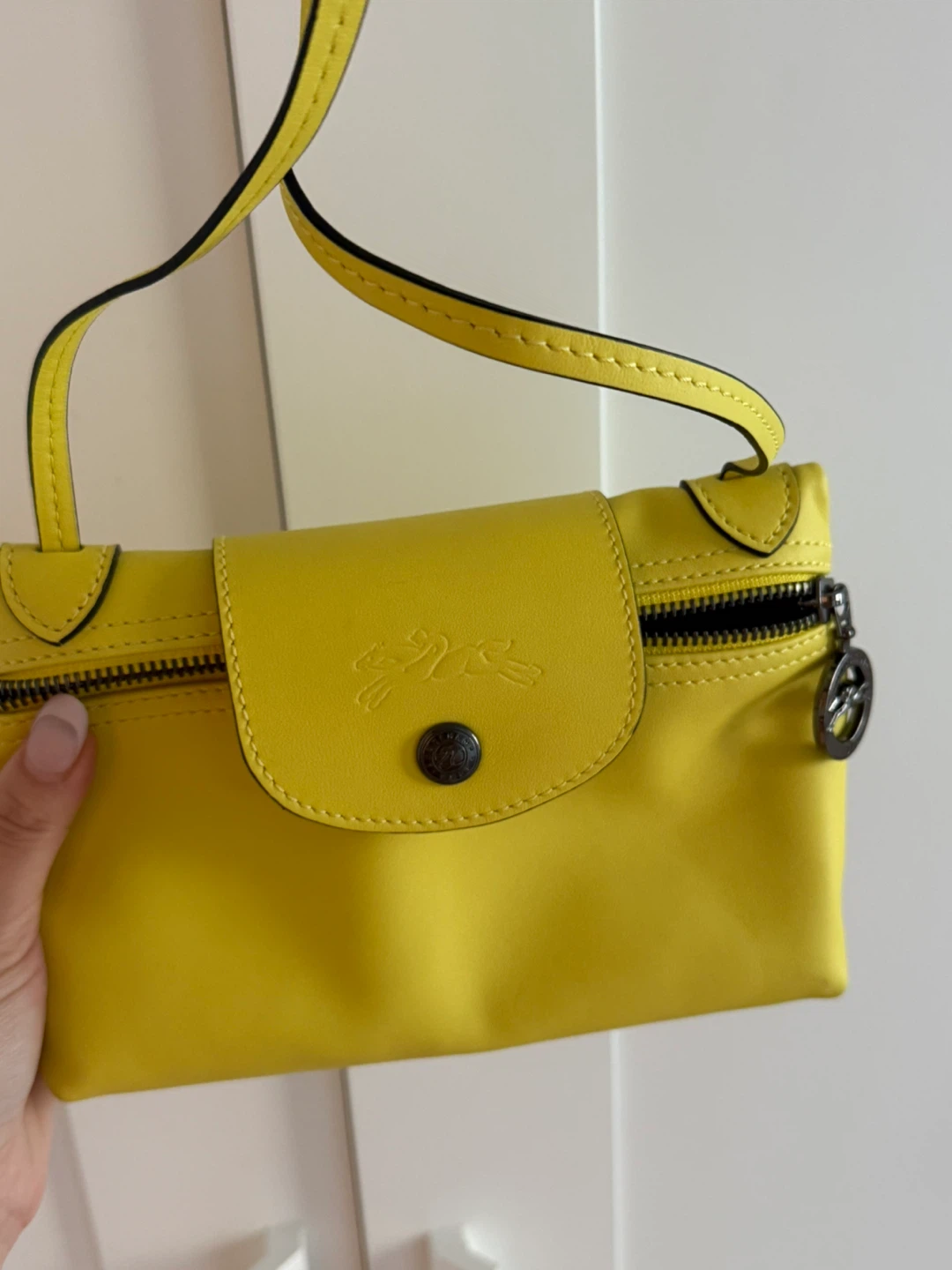 Check out this cute Longchamp Le Pliage Cuir XS crossbody bag! It's a vibrant yellow colour and made of leather. Perfect for adding a pop of colour to any outfit