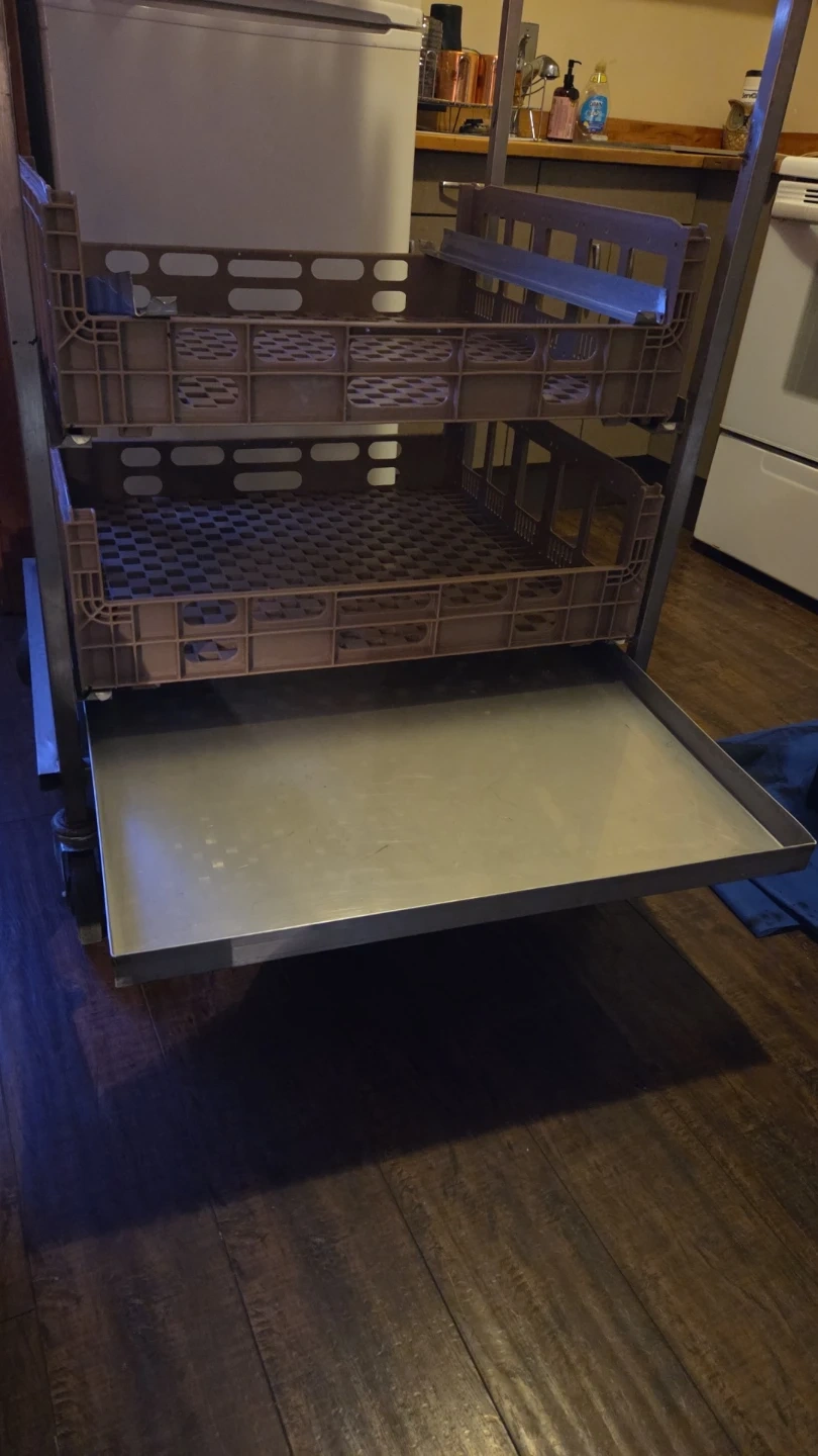 This rolling rack features 5 levels of brown plastic crates with an additional metal shelf at the bottom. It's ideal for storing and transporting baked goods or other kitchen items. The rack has wheels for easy mobility. Great for garages, industrial kitchens, commercial use etc. Dimensions are 68 high 32 wide 27 length