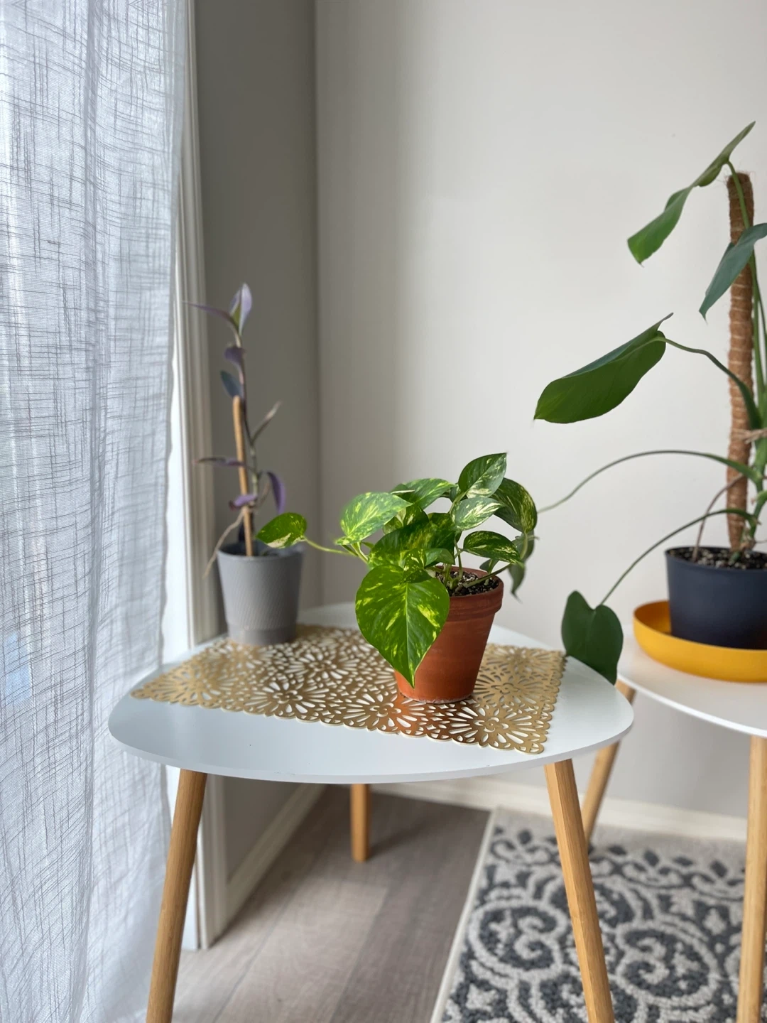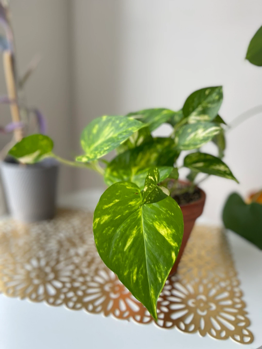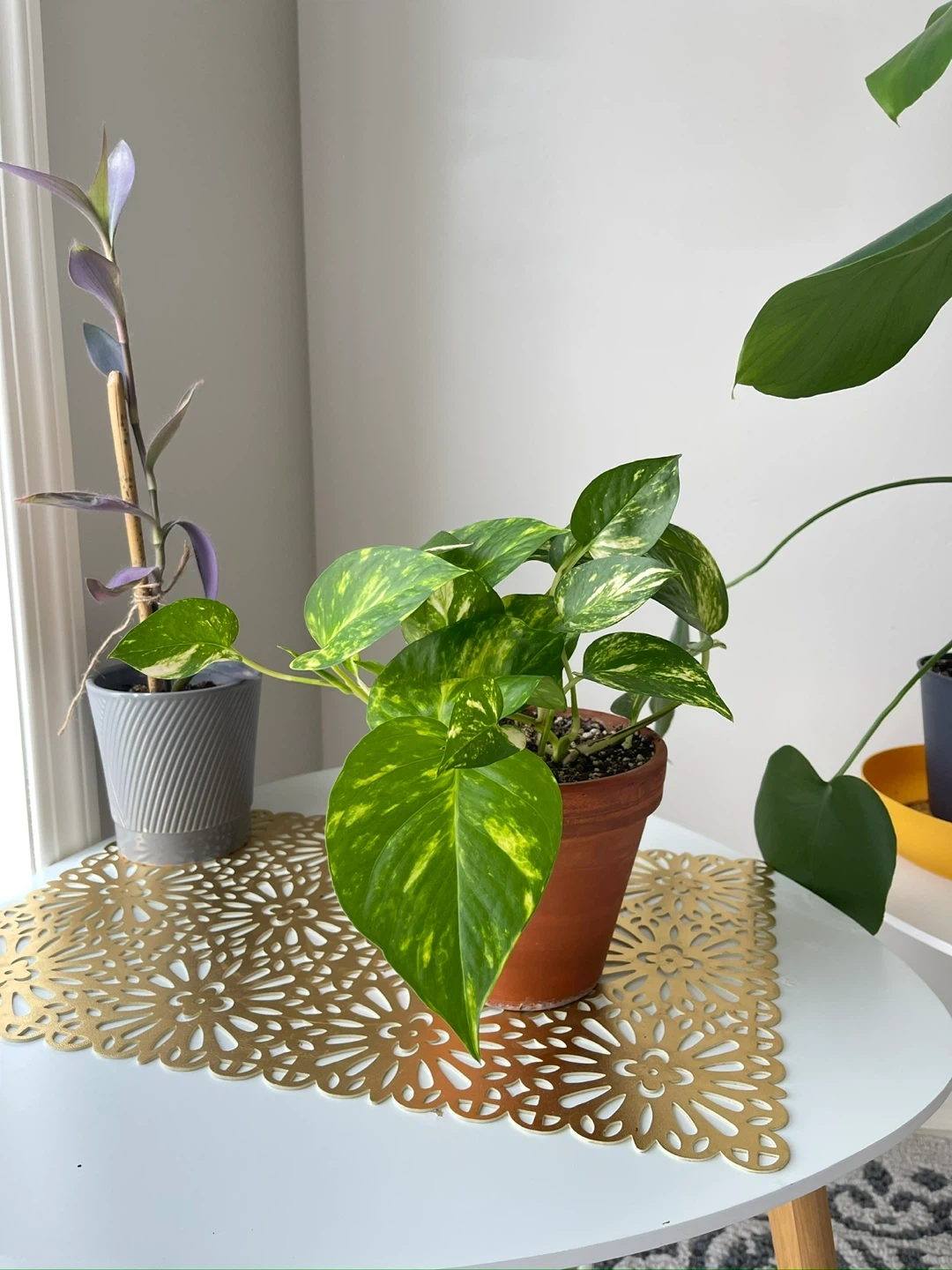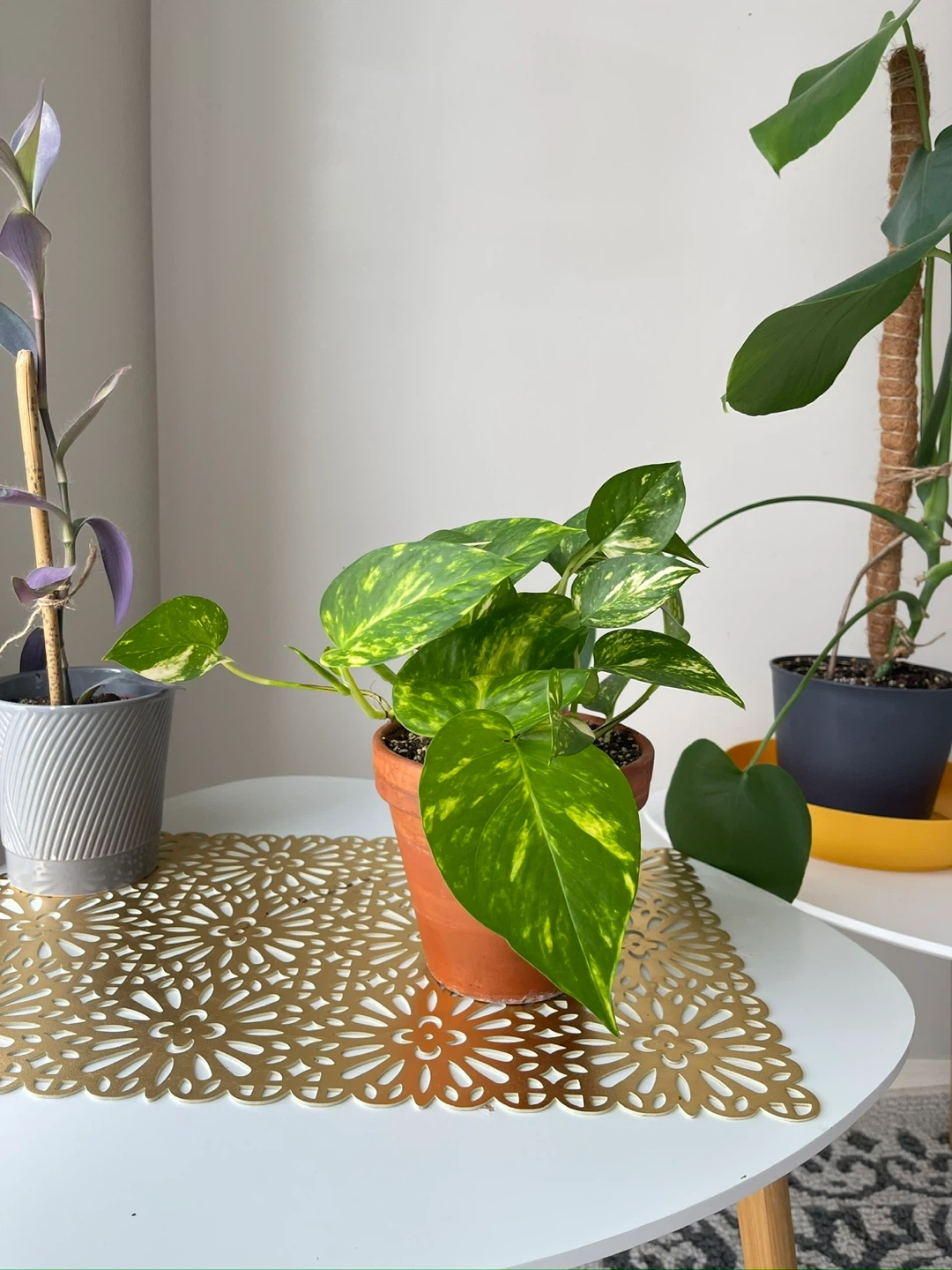 A lovely pothos plant ready to brighten up your space! It's currently potted in a terracotta pot and is looking for a new home. The leaves have a beautiful variegated pattern of green and yellow.