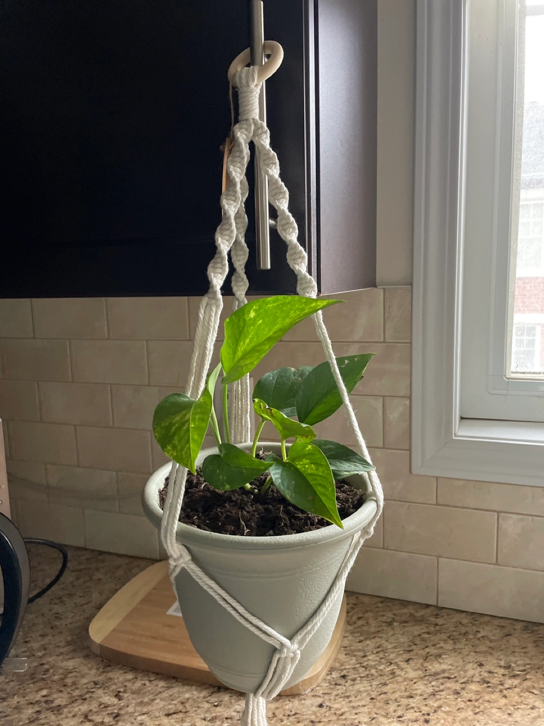 I'm selling a healthy golden pothos plant in a pot. This plant is easy to care for and adds a touch of green to any space! It can be placed on a shelf or hung using a macrame hanger.