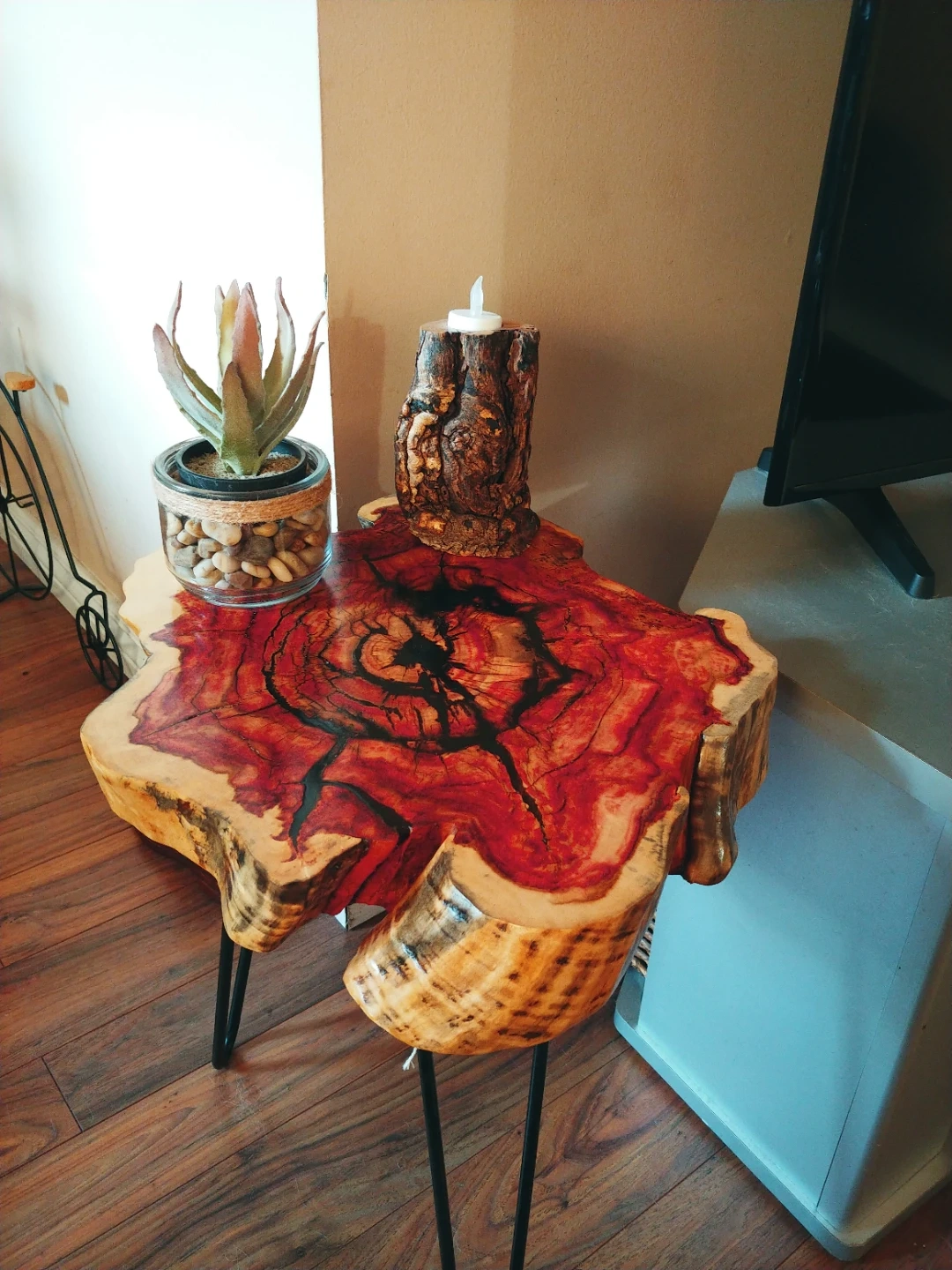 A unique live edge wood slice side table with a red-stained top and natural wood grain. It's supported by sleek black hairpin legs. This table adds a rustic yet modern touch to any space. Great as a plant stand or accent table!