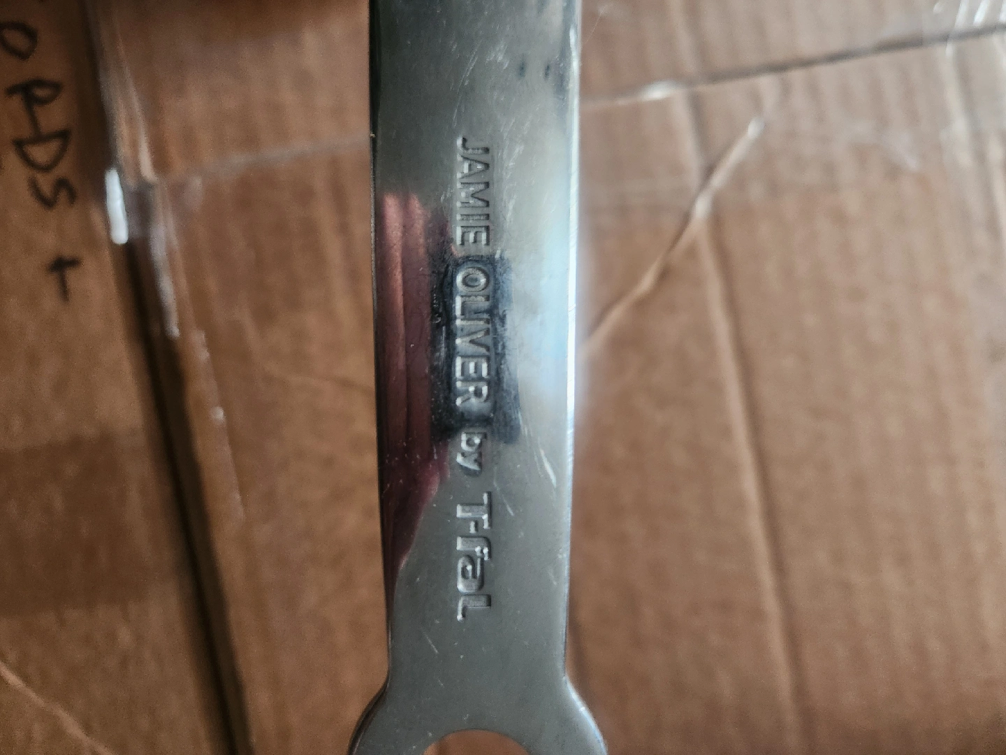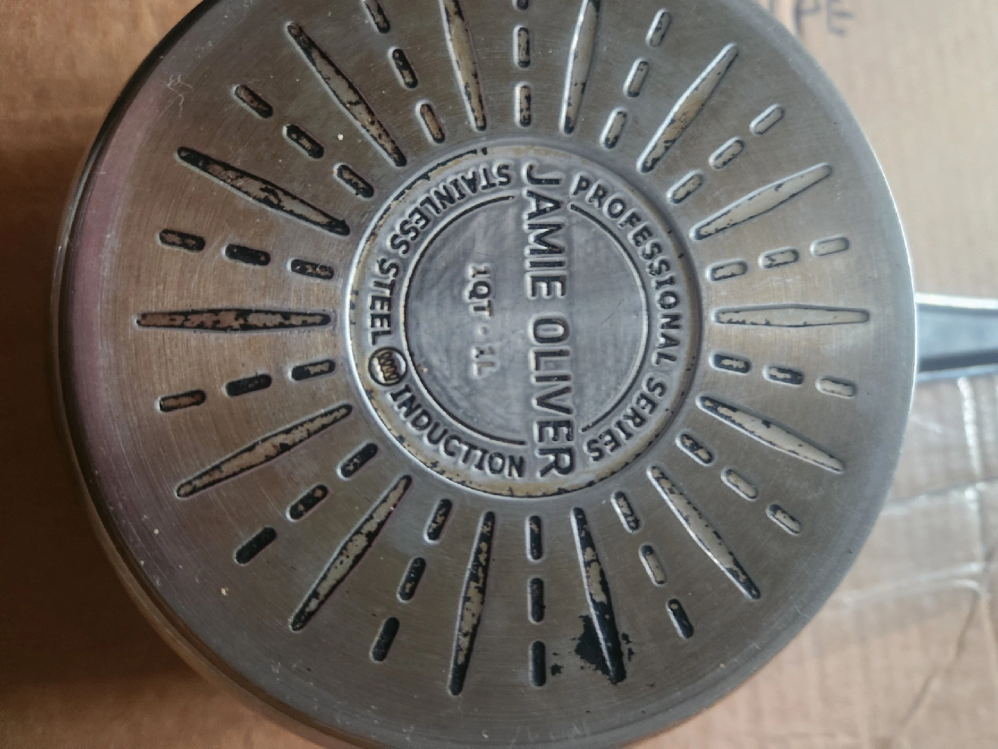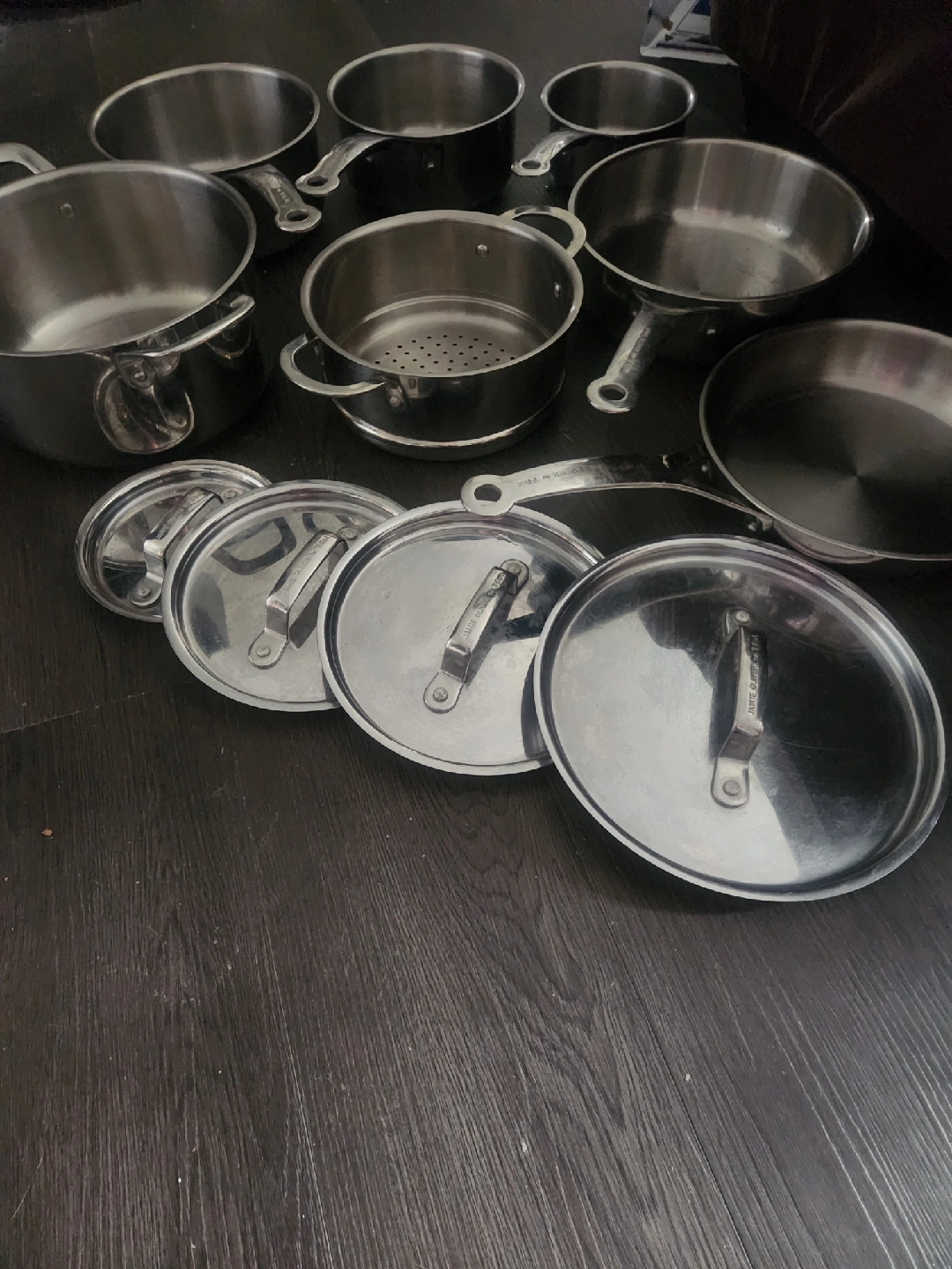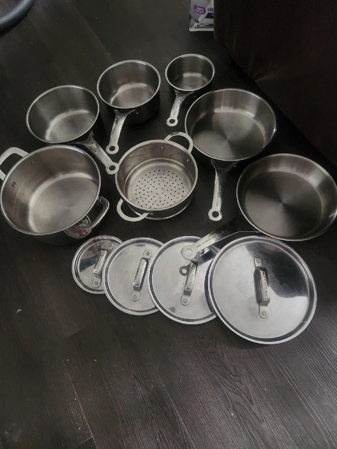 This high-quality set of Jamie Oliver T-Fal Professional Series stainless steel pots and pans is sturdy and perfect for any kitchen, featuring a variety of sizes including a 1-quart pot with a perforated strainer insert, all with matching lids.