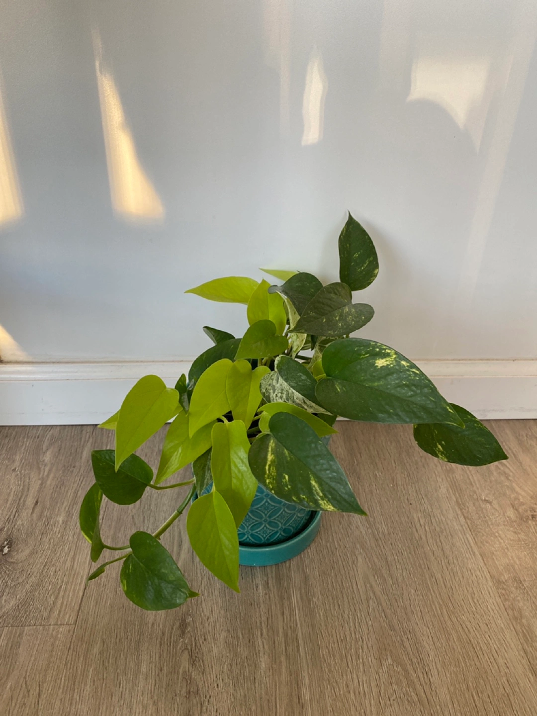 65A beautiful green plant with a variety of leaf colours. The plant sits in a patterned teal pot. A nice plant for your home, it's a perfect addition to a calming atmosphere.