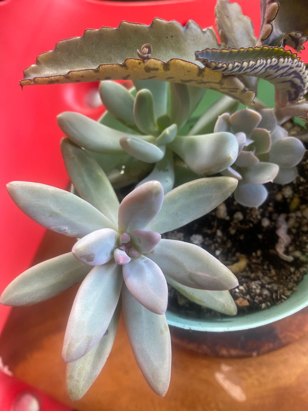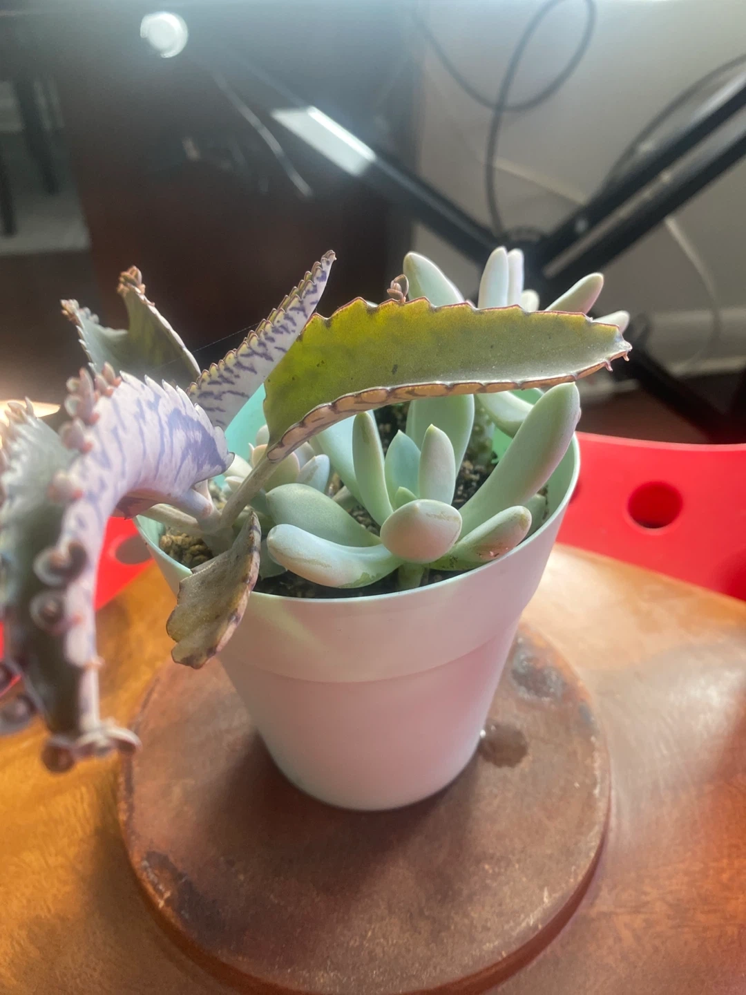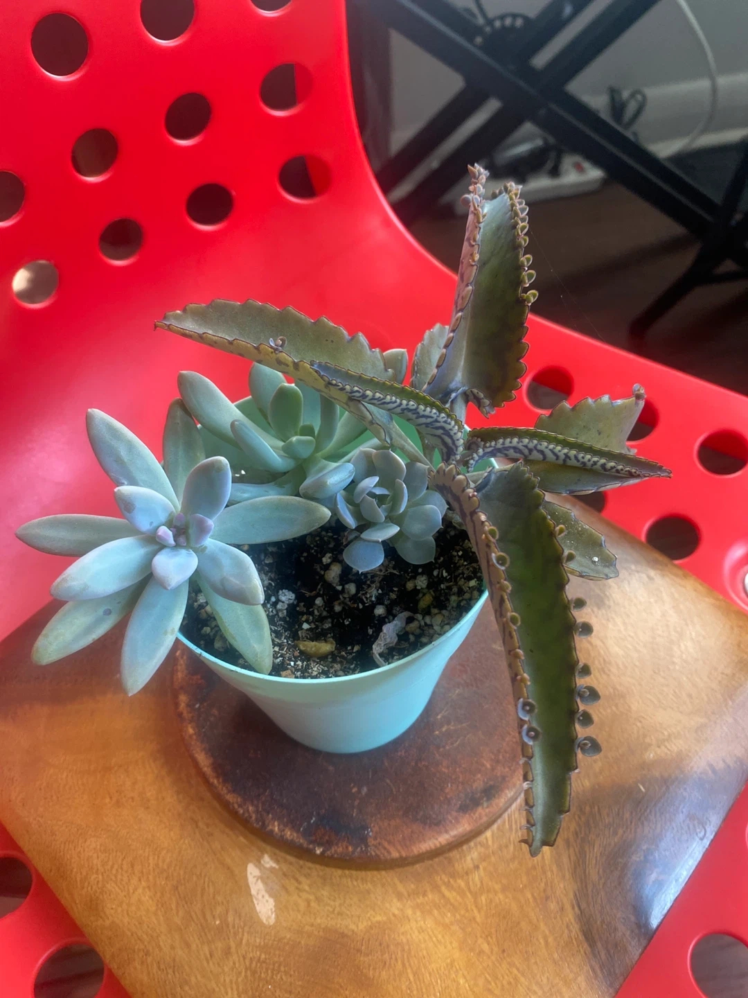 59A lovely little succulent arrangement in a light blue pot! It includes a mother of thousands plant and a ghost plant succulent. Perfect for adding a touch of greenery to your home or office. 4 different plants in a Pot.